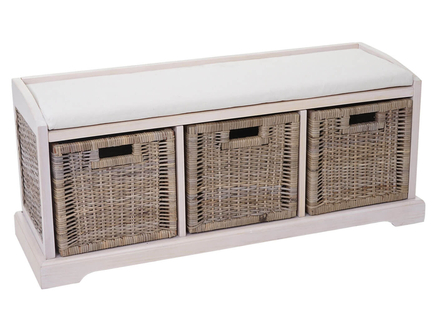 Eine Sitzbank, die es in sich hat. Und zwar wörtlich: Denn dank der 3 großen Körbe findet jeder Schal, jeder Regenschirm, jede Einkaufstasche und noch vieles mehr seinen Platz! Doch können nicht nur all Ihre Sachen in den schönen Körben ruhen, auch Sie können sich entspannt hinsetzen, denn die Bank mit ihrem Sitzpolster bietet einen hohen Sitzkomfort. Eine Sitzbank, die den Anforderungen durch ihr Massivholz also prima gewachsen ist! Der Bezug des Kissens ist auch leicht abnehmbar und waschbar, falls mal ein Fleck darauf kommen sollte. Bei Kubu handelt es sich um sehr festes, ungeschältes Rattan in naturbelassener Färbung.