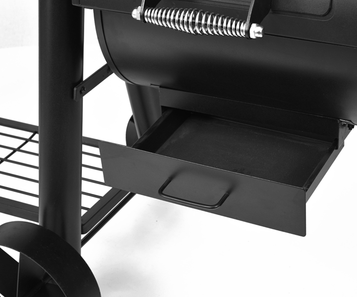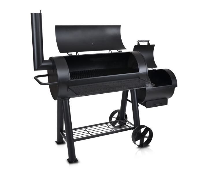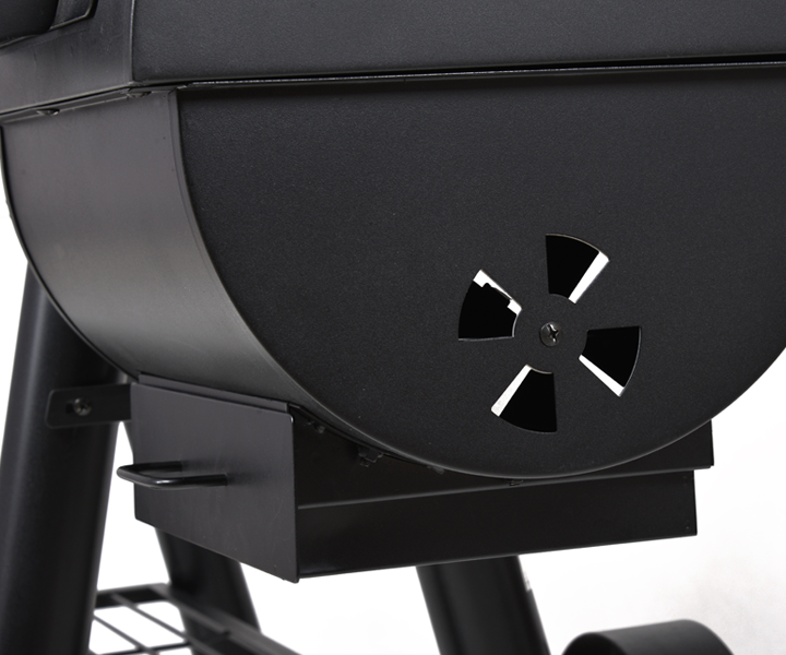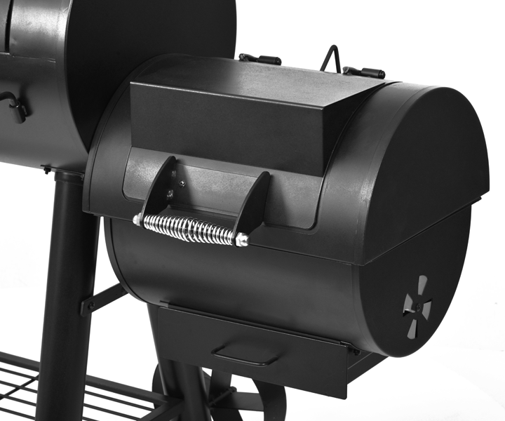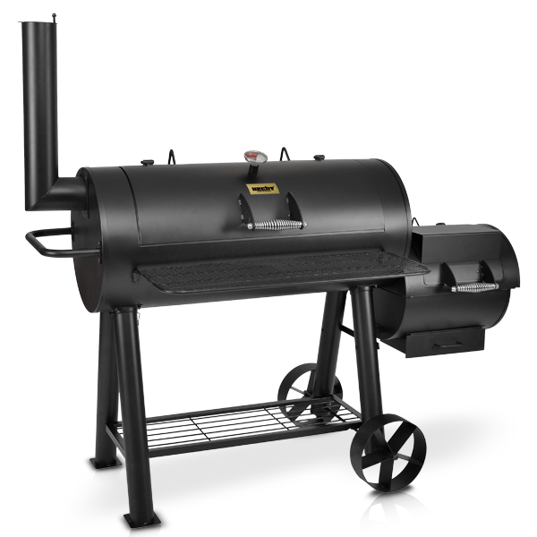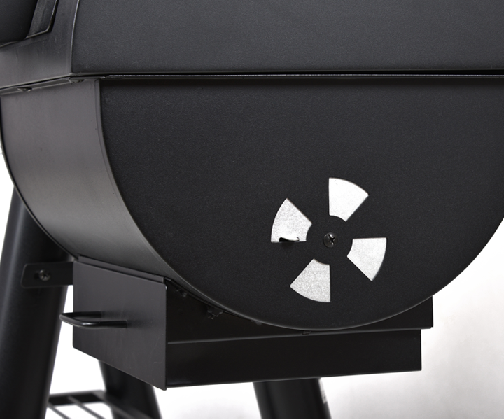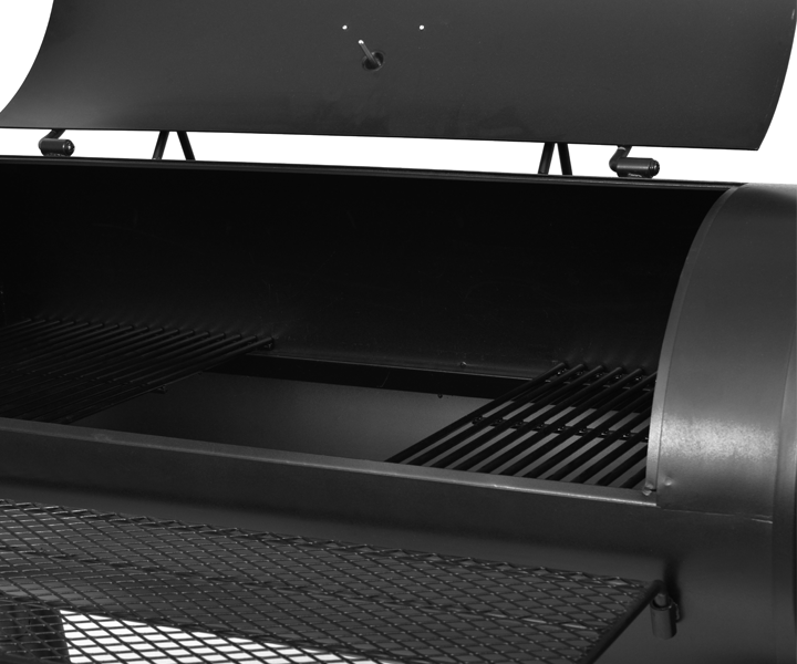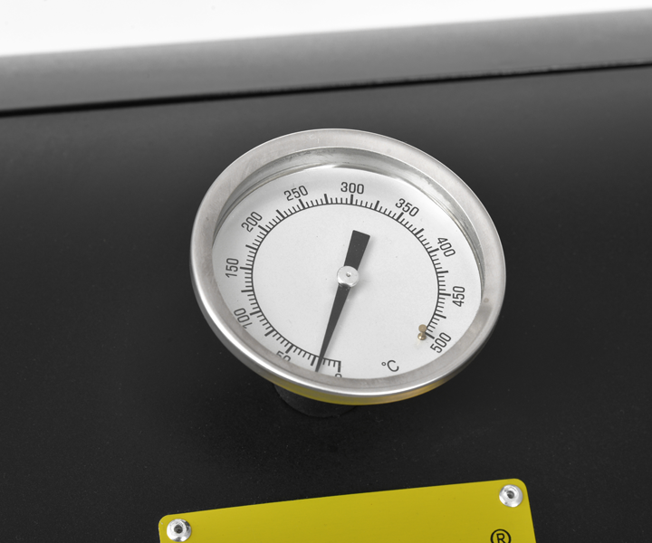 Bei dieser Bauart werden die heißen Rauchgase zunächst in die Side-Fire-Boxam Boden der Garkammer geführt. Der Rauch verteilt sich dort und wird dann über einen Schornstein ausgeleitet. So ergibt sich eine gleichmäßigere Temperaturverteilung im Garraum des Grills. Im Deckel befindet sich eine Temperaturanzeige bis 500°C, für optimales Überwachen des Grillgutes. Die Temperaturregelung in der Garkammer erfolgt zum einen über die Menge und die Art des Brennmaterials, zum anderen über Klappen, die die Sauerstoffzufuhr zur Brennkammer und die Rauchgasabfuhr im Kamin regeln. Die Garroste aus porzellanbeschichtetem Stahl sorgen dafür, dass sich die Speisen gut vom Rost lösen lassen.