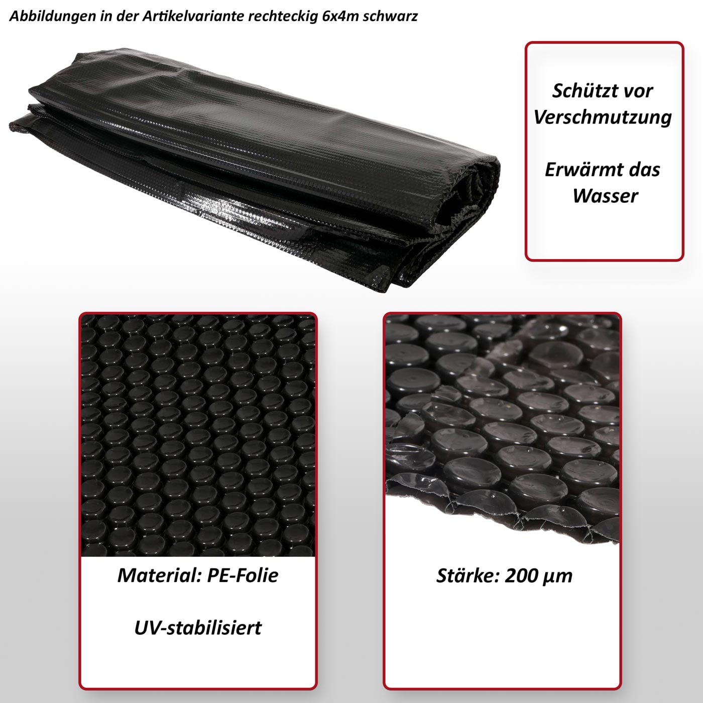 Genießen Sie kristallklares Wasser und angenehme Temperaturen in Ihrem Pool – mit dieser hochwertigen Solarplane schützen Sie Ihr Poolwasser effektiv vor Verschmutzungen und Wärmeverlust. Die Solarfolie schwimmt direkt auf der Wasseroberfläche. reduziert die Verdunstung und nutzt die Kraft der Sonne. um das Wasser auf natürliche Weise zu erwärmen.
