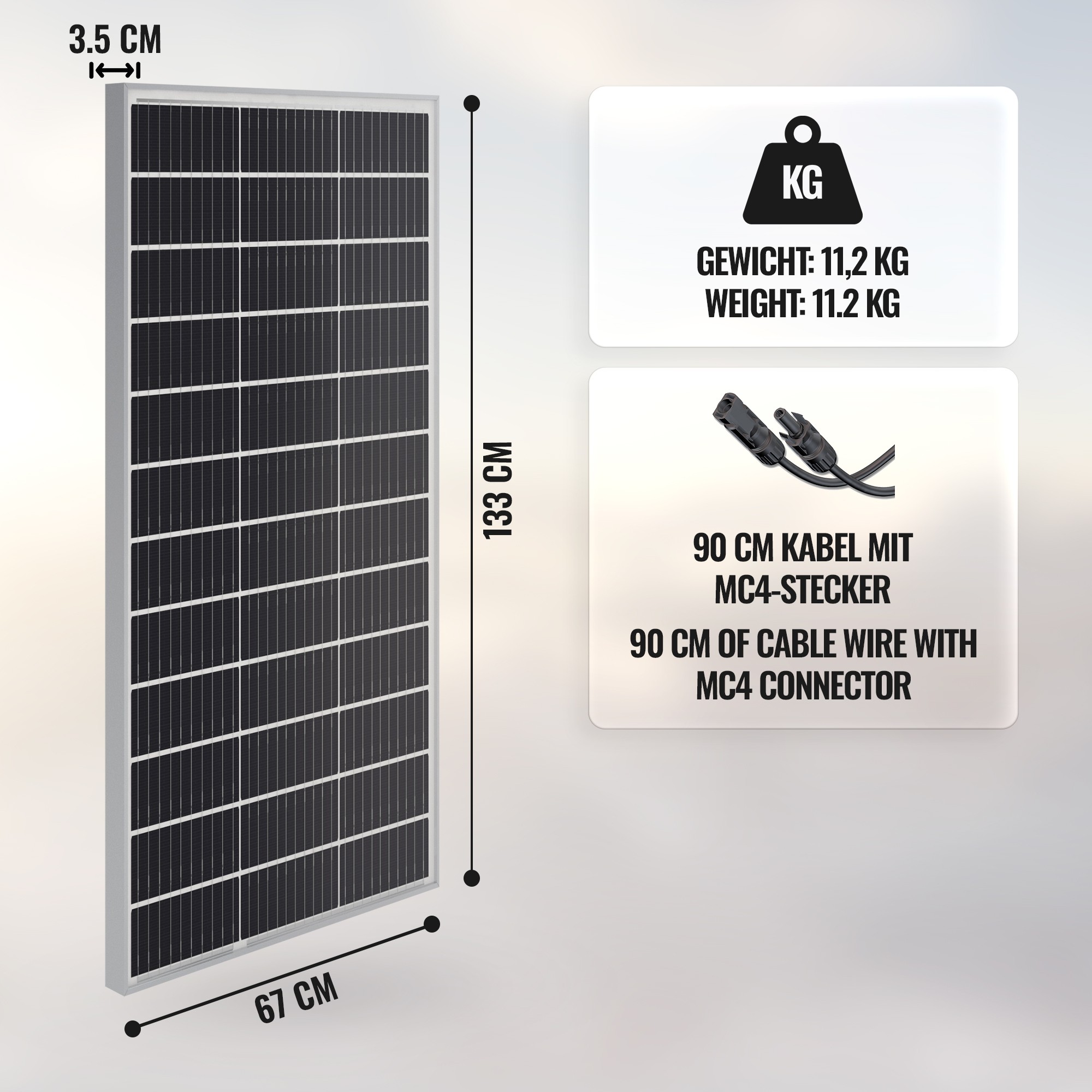 - Hocheffizientes monokristallines Solarmodul mit einer Leistung von 150 W: 1330 x 670 x 35 mm