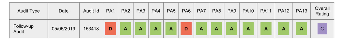 Soziales Managementsystem (PA1 = D), Arbeitnehmerschutz (PA2 = A), Recht auf Kollektivverhandlungen/Vereinigungsfreiheit (PA3 = A), Keine Diskriminierung (PA4 = A), Angemessene Vergütung (PA5 = A), Angemessene Arbeitszeit (PA6 = D), Arbeitssicherheit und Gesundheitsschutz (PA7 = A), Keine Kinderarbeit (PA8 = A), Arbeitsschutz für Jugendliche (PA9 = A), Keine Scheinbeschäftigung (PA10 = A), Zwangsarbeit (PA11 = A), Umweltschutz (PA12 = A), Ethisches Geschäftsverhalten (PA13 = A)