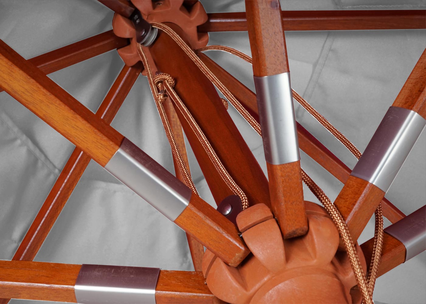 Der sichere Stand wird durch die mit Aluminium verstärkte Verstrebung und dem massiven 5 cm starken Holzmast gewährleistet. Das Winddach sorgt dafür, das kein gefährlicher Windfang entsteht und die Luft zirkulieren kann. Auch bei einem leichten Regenschauer können Sie in Ruhe sitzen bleiben. Dafür sorgt der wasserabweisende Stoff aus gewebtem Polyester (Spun Poly). Dieser ist gegenüber einem normalen Polyester-Baumwollgemisch doppelt so langlebig, formstabil, atmungsaktiv, waschbar und muss nicht gebügelt werden. Das Mastende ist durch eine ca. 40 cm lange Aluminiumhülse ummantelt, welche ein Eindringen von Feuchtigkeit in das Holz verhindert. Der Schirm ist damit sowohl in einer Bodenhülse, als auch in einem Schirmständer bedenkenlos nutzbar. Durch das leichtgängige Seilzugsystem ist das Öffnen und Schließen kinderleicht. Dank der modernen Farbauswahl ist für jeden Geschmack das richtige Modell dabei. Überzeugen Sie sich selbst von Qualität und Design.