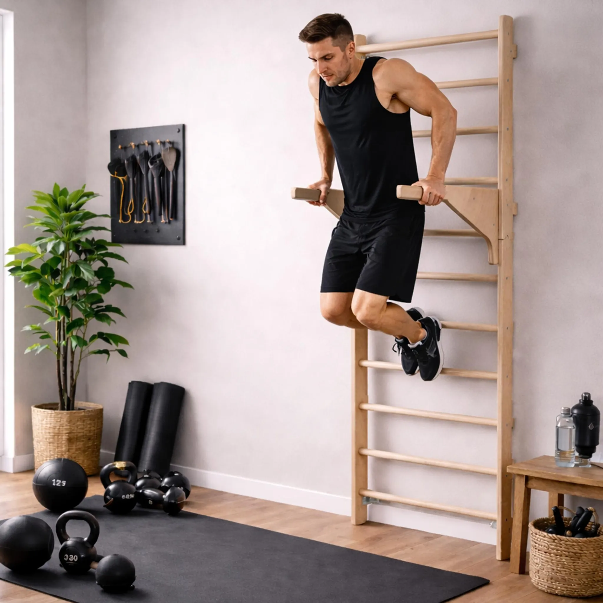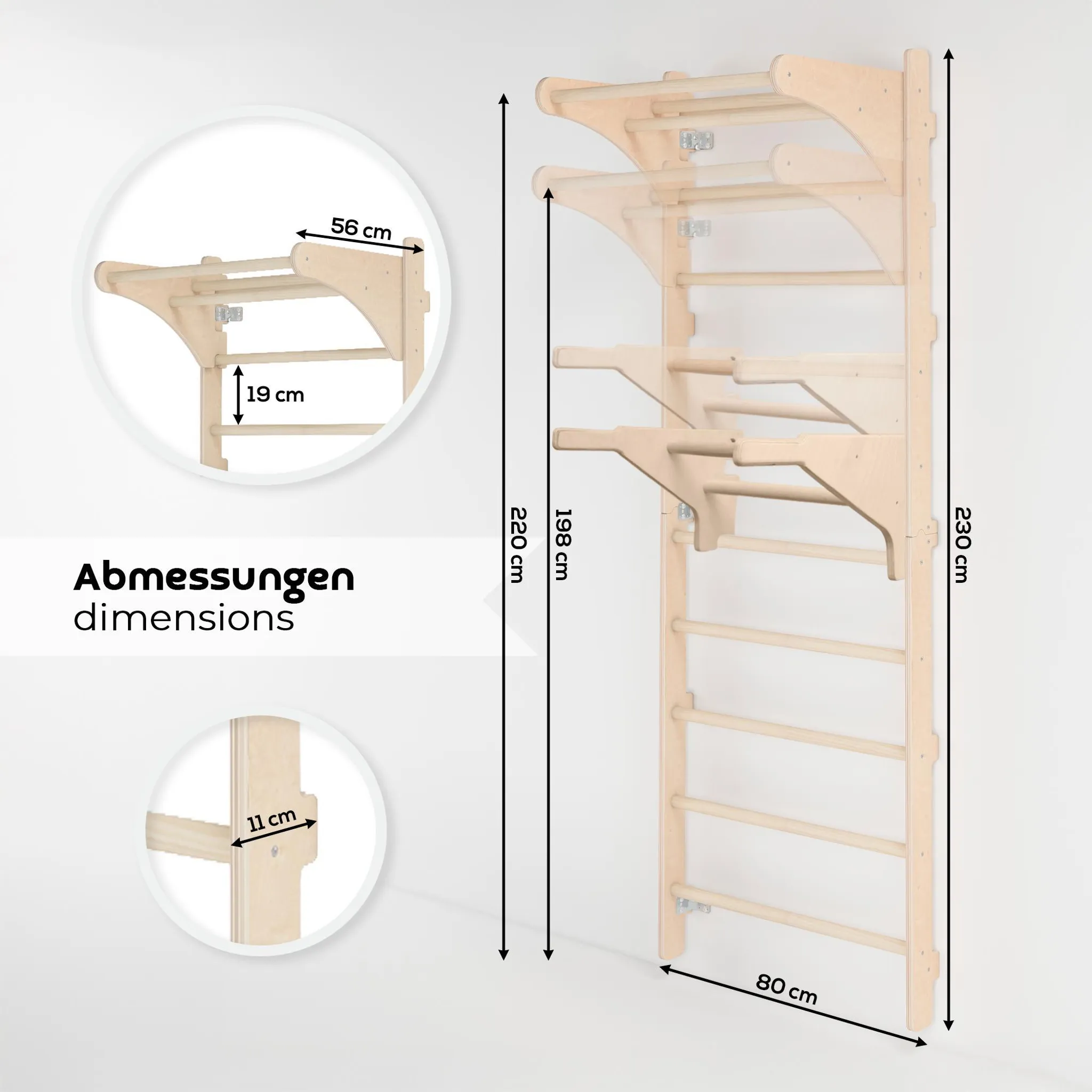 Diese Sprossenwand bietet eine vielseitige und platzsparende Lösung für Ihr Ganzkörpertraining zu Hause. Gefertigt aus hochwertigem Naturholz, fügt sich die Gymnastikleiter harmonisch in jeden Wohnraum ein und verbindet Funktionalität mit einem ästhetischen Design. Mit ihrer Gesamthöhe von 220 cm und einer Breite von 80 cm (oder bis zu 230 cm Höhe mit dem Klimmzuggriff) bietet die Sprossenwand eine solide Basis für Kraft-, Mobilitäts- und Stabilisationsübungen, während die stabile Wandmontage Platz spart. Das Set beinhaltet höhenverstellbare Dip-Barren, einen ergonomischen Klimmzuggriff sowie längenverstellbare Holz-Turnringe. Diese Kombination ermöglicht ein breites Spektrum an Übungen – von Dips und Klimmzügen bis hin zu intensiven Dehn- und Mobilitätsübungen. Die einfache Wandmontage und die flexibel kombinierbaren Elemente machen dieses Gerät zum idealen Partner für Einsteiger und Fortgeschrittene gleichermaßen.