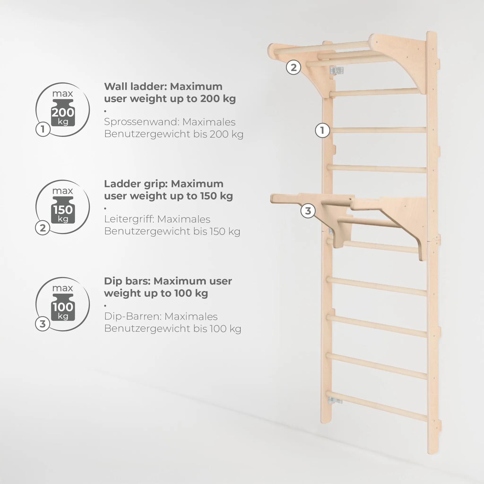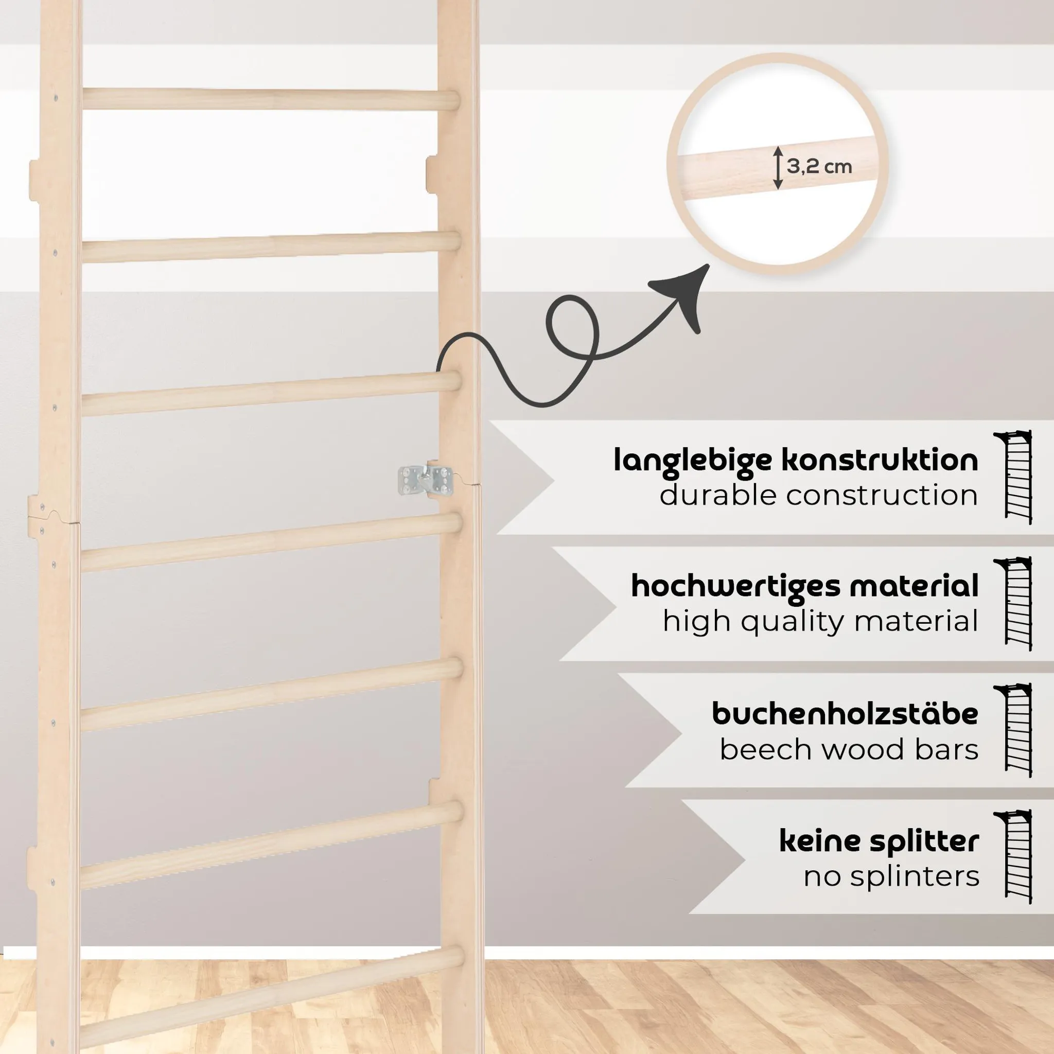 | Lieferumfang | 1x Gymnastikleiter, 1x Griff, 1x Dip-Barren, 1x Paar verstellbare Holzringe |