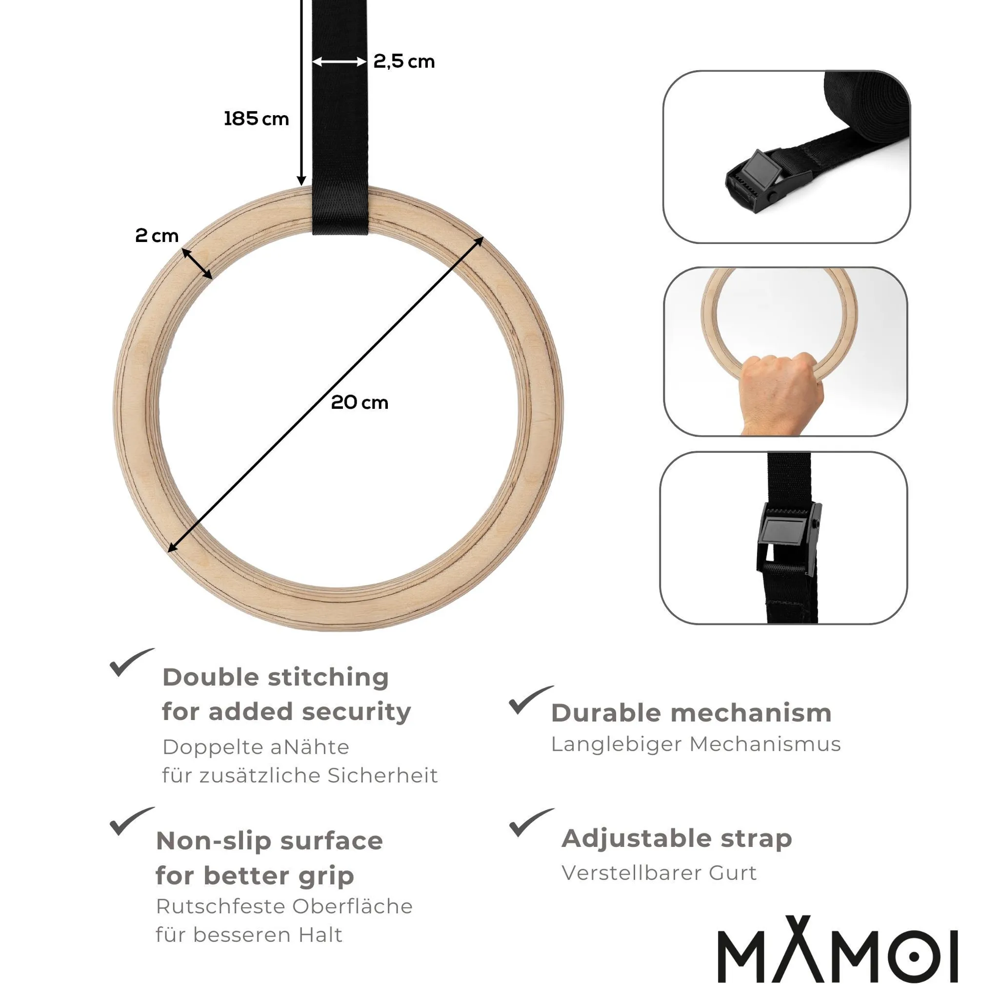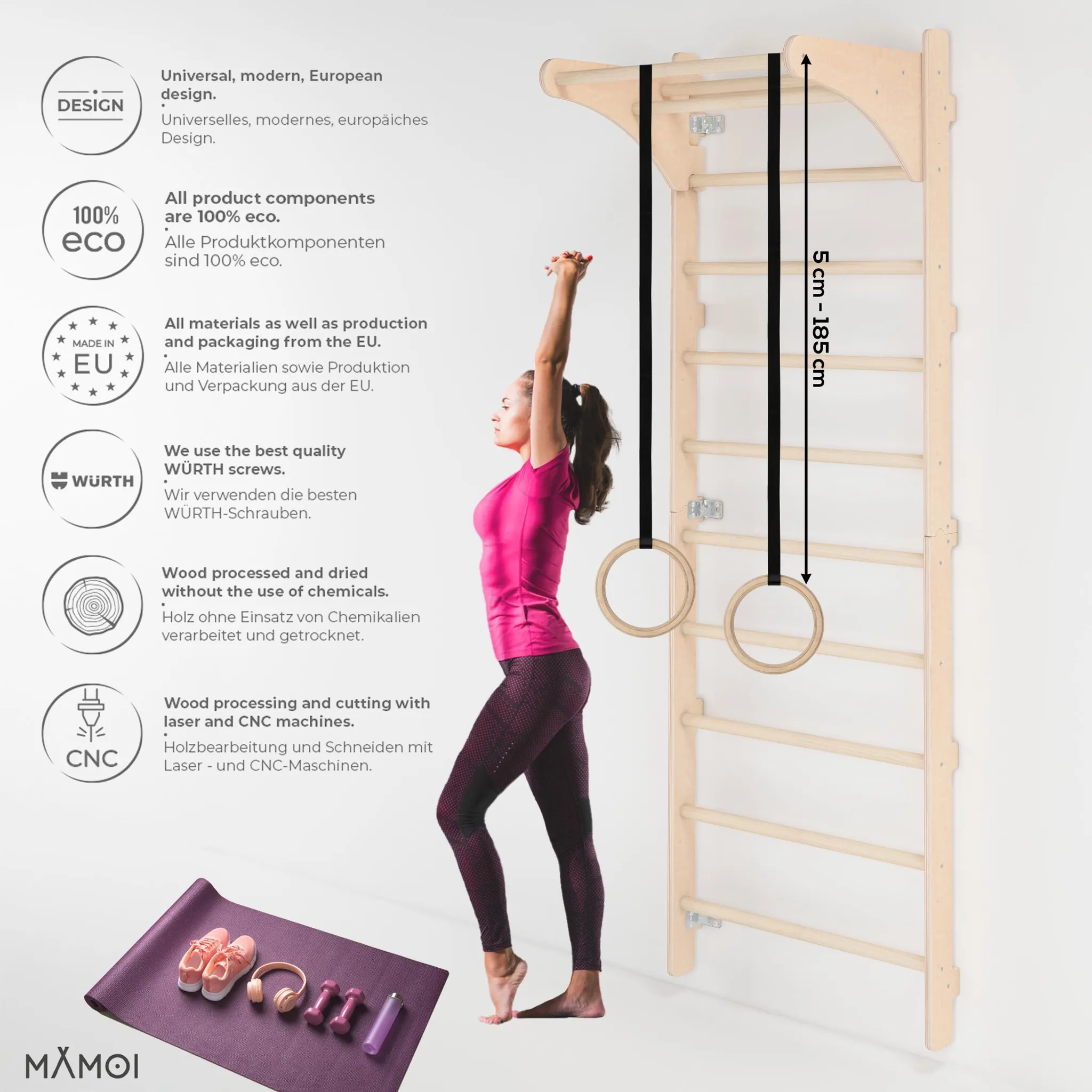 Sprossenwand Komplett-Set aus Holz mit verstellbaren Turnringen, Dip-Barren und Klimmzuggriff – Heimtraining bis 100 kg