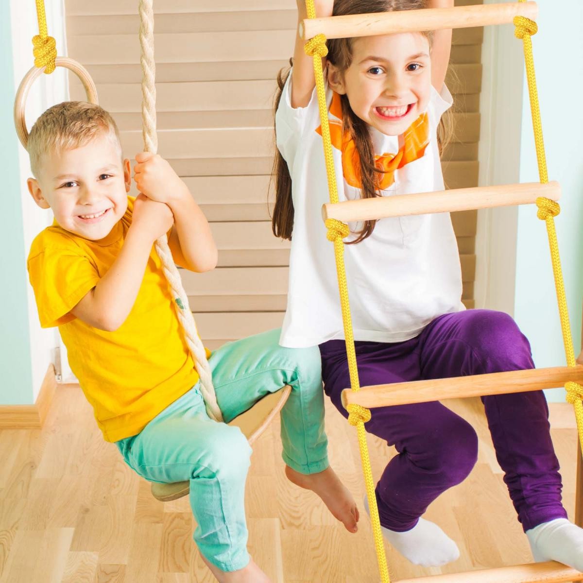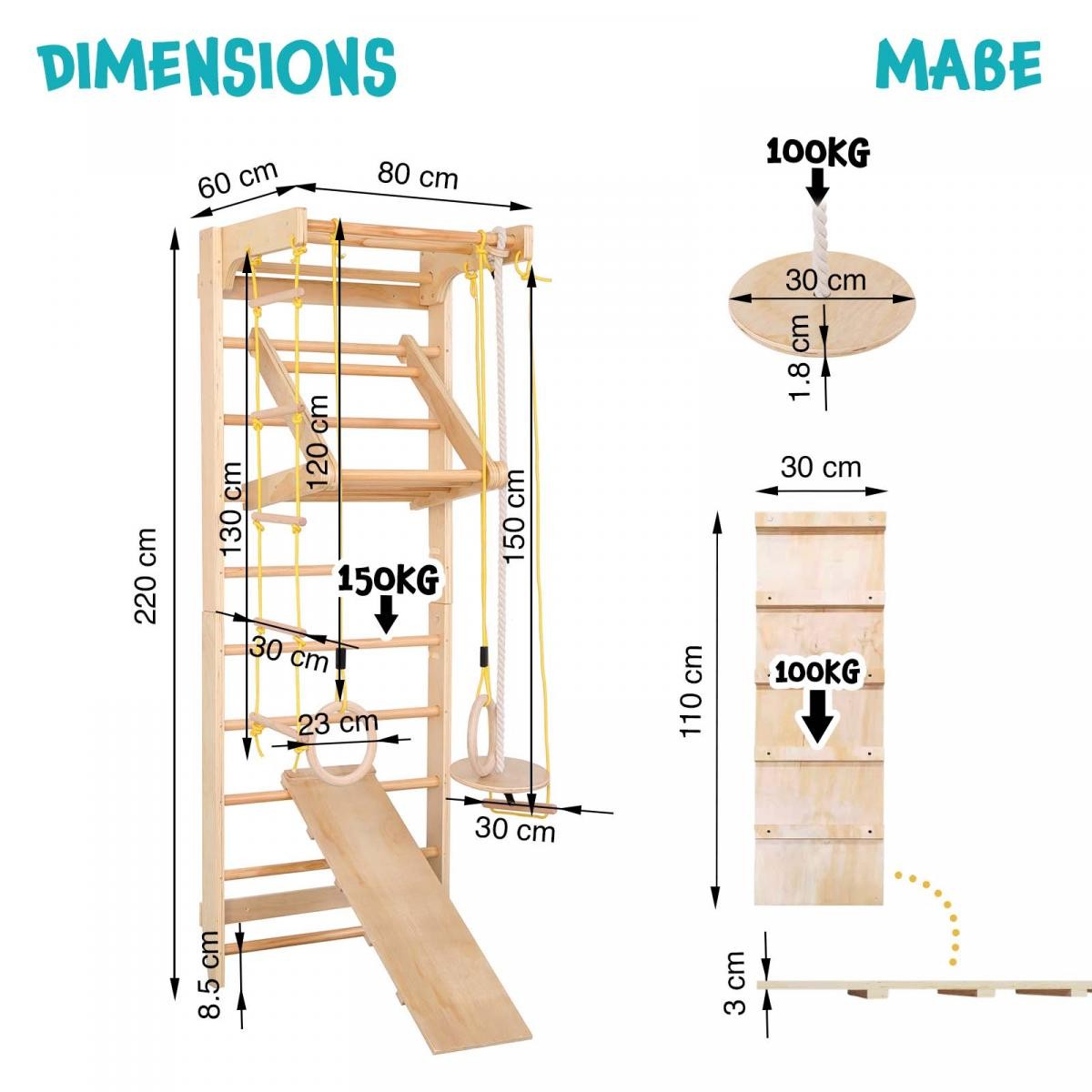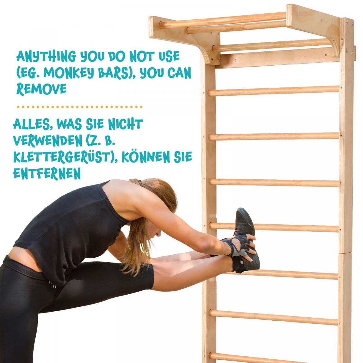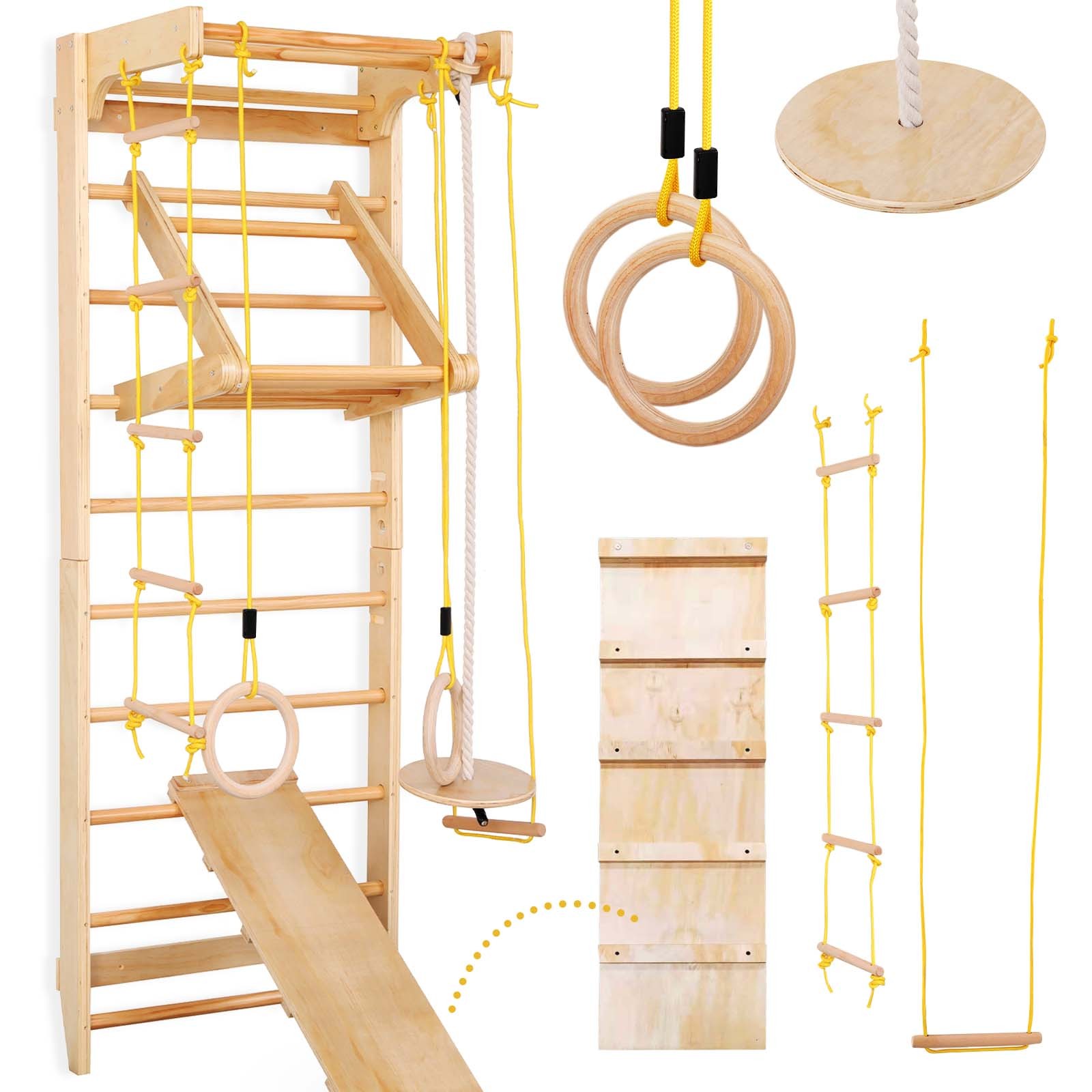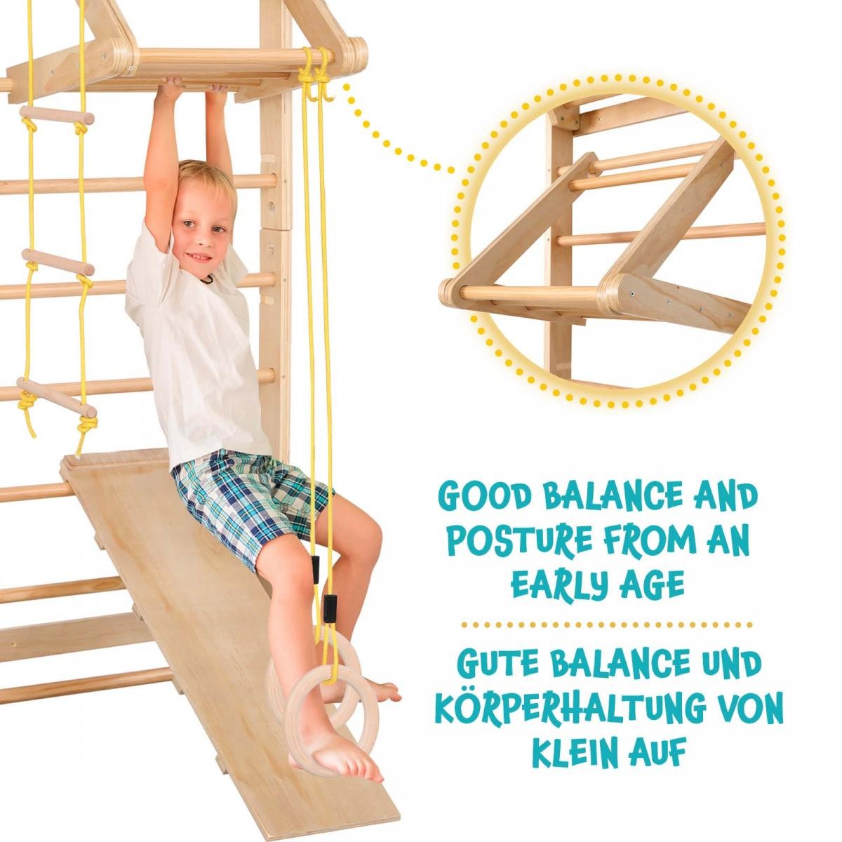 Das Sprossenwand Set wurde für zwei Zwecke entworfen: einerseits für das aktive Vergnügen der Kinder, andererseits als klassisches Trainingsgerät für eine Vielzahl von Sport- und Dehnungsübungen. Das aus einer Kombination von Sperrholz und Kiefernholz gefertigte Set ist ein zuverlässiges und langlebiges Turngerät.