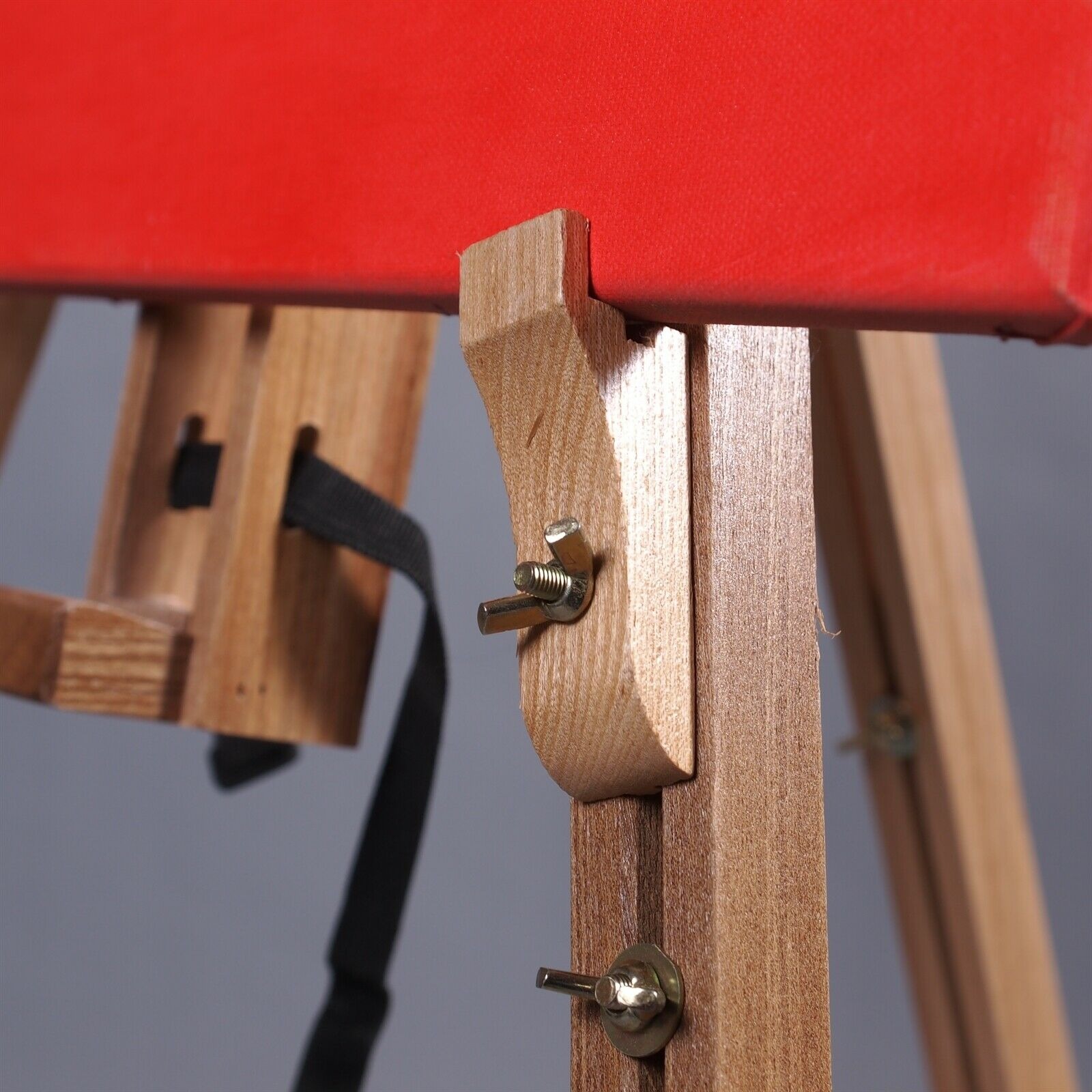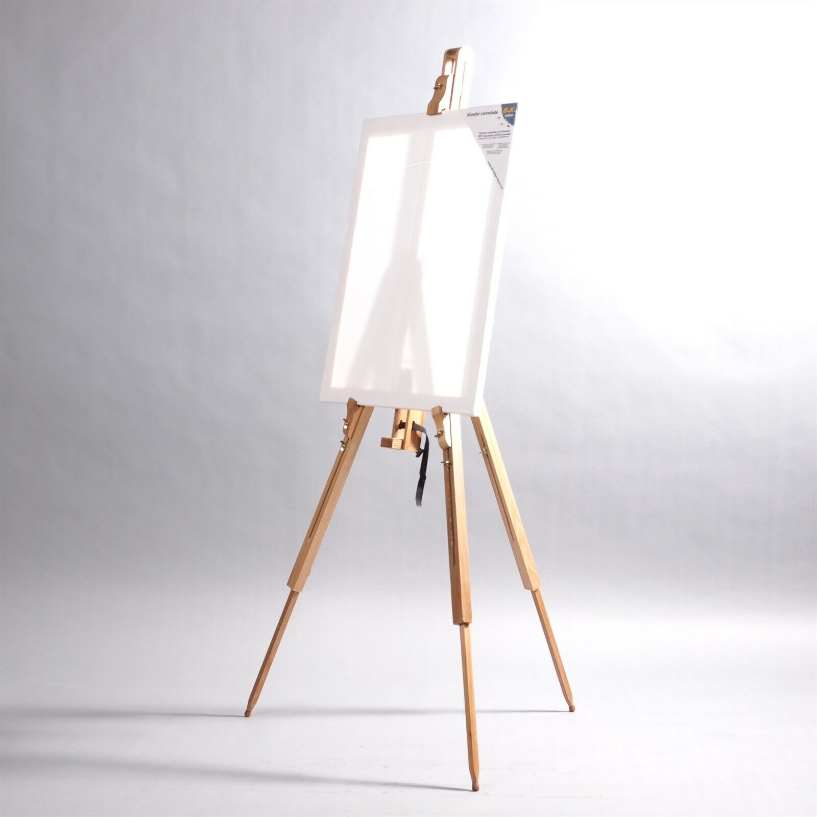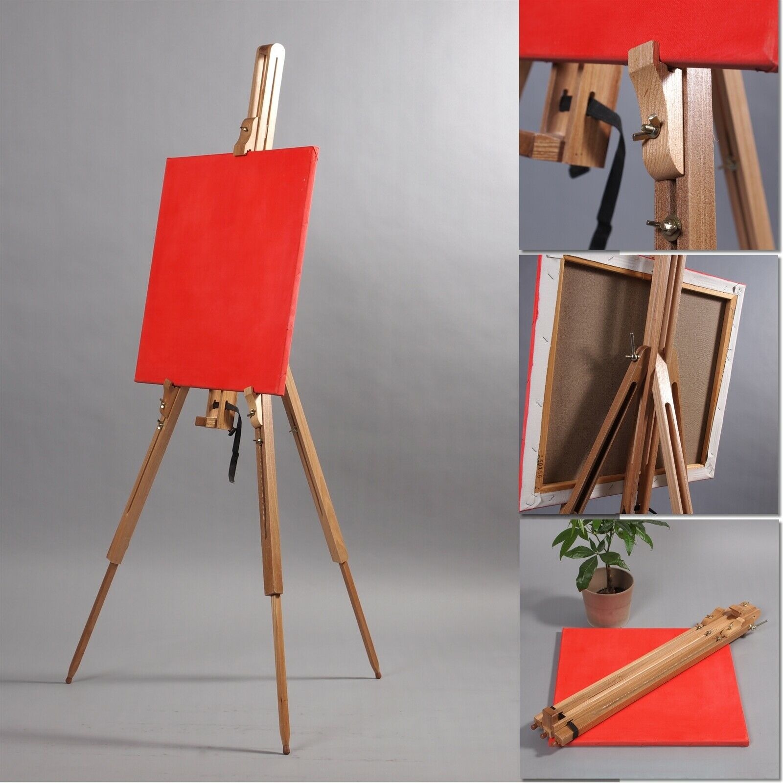 Die solide Staffelei ist aus Buchenholz gefertigt und äußerst stabil, robust und dennoch leicht. Sie ist für Leinwände von 12 cm bis zu 100 cm Höhe und 2,5 cm Stärke geeignet. Die Staffelei ist größtenteils schon vormontiert und gewährleistet einen einfachen Aufbau ohne Werkzeug. Somit ist sie sofort einsetzbar.