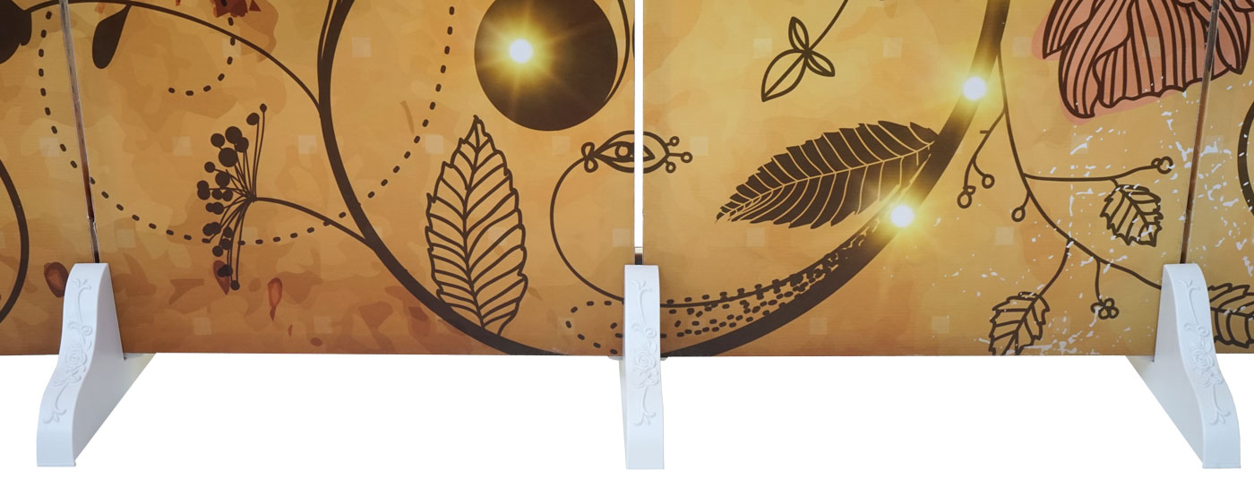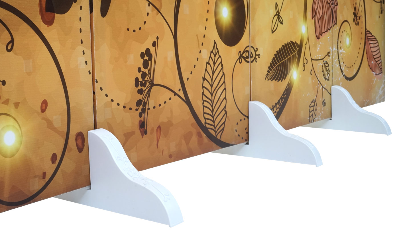 Um Ihre Trennwand in voller Pracht und Breite zur Geltung zu bringen, bieten wir daher eine besonders schmucke Lösung: weiße Standfüße mit Ornament-Struktur. Ganz einfach zwischen die einzelnen Abteile platziert, geben sie dem Paravent nicht nur ausreichend Stabilität um gerade zu stehen, sondern versetzen den Paravent auch in ein standesgemäßes“ Gesamtbild. Sie haben auch die Möglichkeit die Standfüße an Ihrem Paravent festzuschrauben, dank speziell vorgebohrter Löcher in der Mitte der Füße.