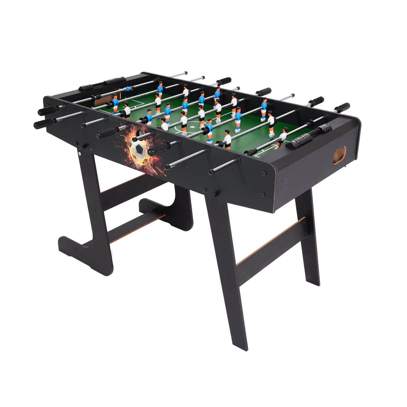 Dieser Kickertisch hat ein ausgesprochen gutes Preis-Leistungsverhältnis. Unsere Vorteile: ergonomisch geformte Griffe, Gleitlager für leichtes Spiel, geschraubte Spielfiguren, ein an den Ecken nahtlos hochgezogenes Spielfeld (der Ball kann nicht in einer Ecke liegen bleiben), zwei Streben unter dem Spielfeld sowie Querverstrebungen an den Standbeinen für eine hohe Standfestigkeit.