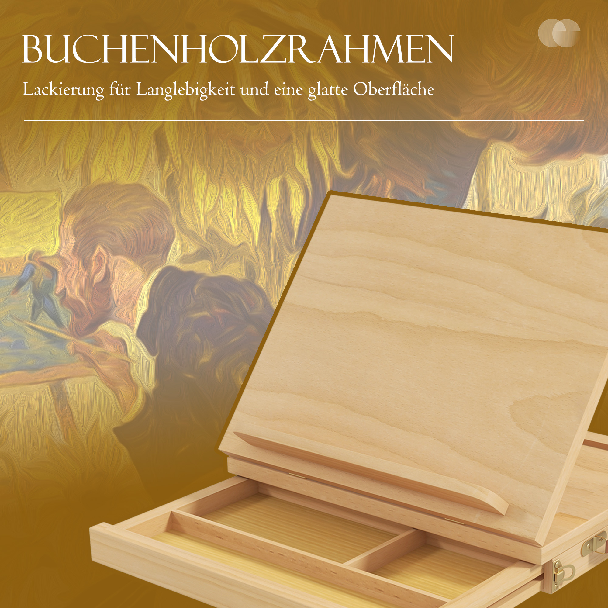 Entdecken Sie die künstlerische Brillanz mit der Vinsetto Tischstaffelei! Die verstellbare Neigung verleiht Ihrer Kreativität Flügel, indem Sie Ihre inneren Meisterwerke entfesseln. Praktische Fächer für Pinsel, Farben und mehr halten Ihr Arbeitsumfeld organisiert. Gefertigt aus hochwertigem Buchenholz, trotzt diese Staffelei den anspruchsvollsten Künstleranforderungen. Entfesseln Sie Ihre Fantasie und gestalten Sie mit diesem unwiderstehlichen Meisterstück den Weg zu Ihrer künstlerischen Reise!