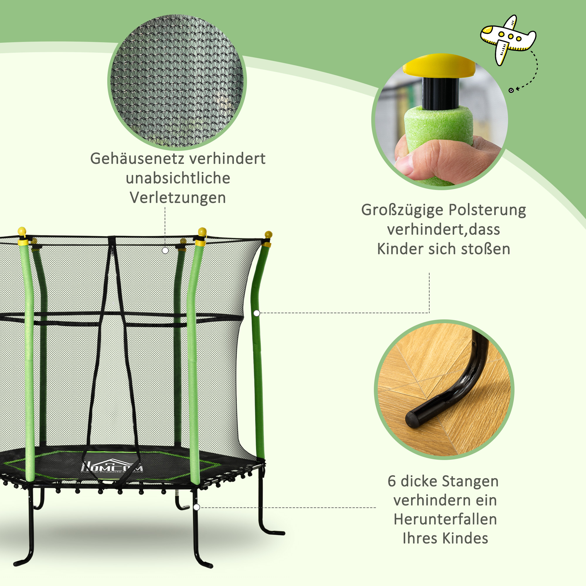 Sicherheit und Spaß! Unser Trampolin für Kinder von HOMCOM erfüllt die höchsten Sicherheitsanforderungen und steht für uneingeschränktes Sprungvergnügen! Das hochwertige Sicherheitsnetz und die gepolsterten Stützstangen sorgen für einen sicheren und unbekümmerten Sprungspaß. Der Durchgang im Sicherheitsnetz ist mit einem bequemen Reißverschluss ausgestattet. Auf dem Trampolin können Ihre Kinder spielend den Gleichgewichtssinn, die Koordination und die Körperspannung stärken.
