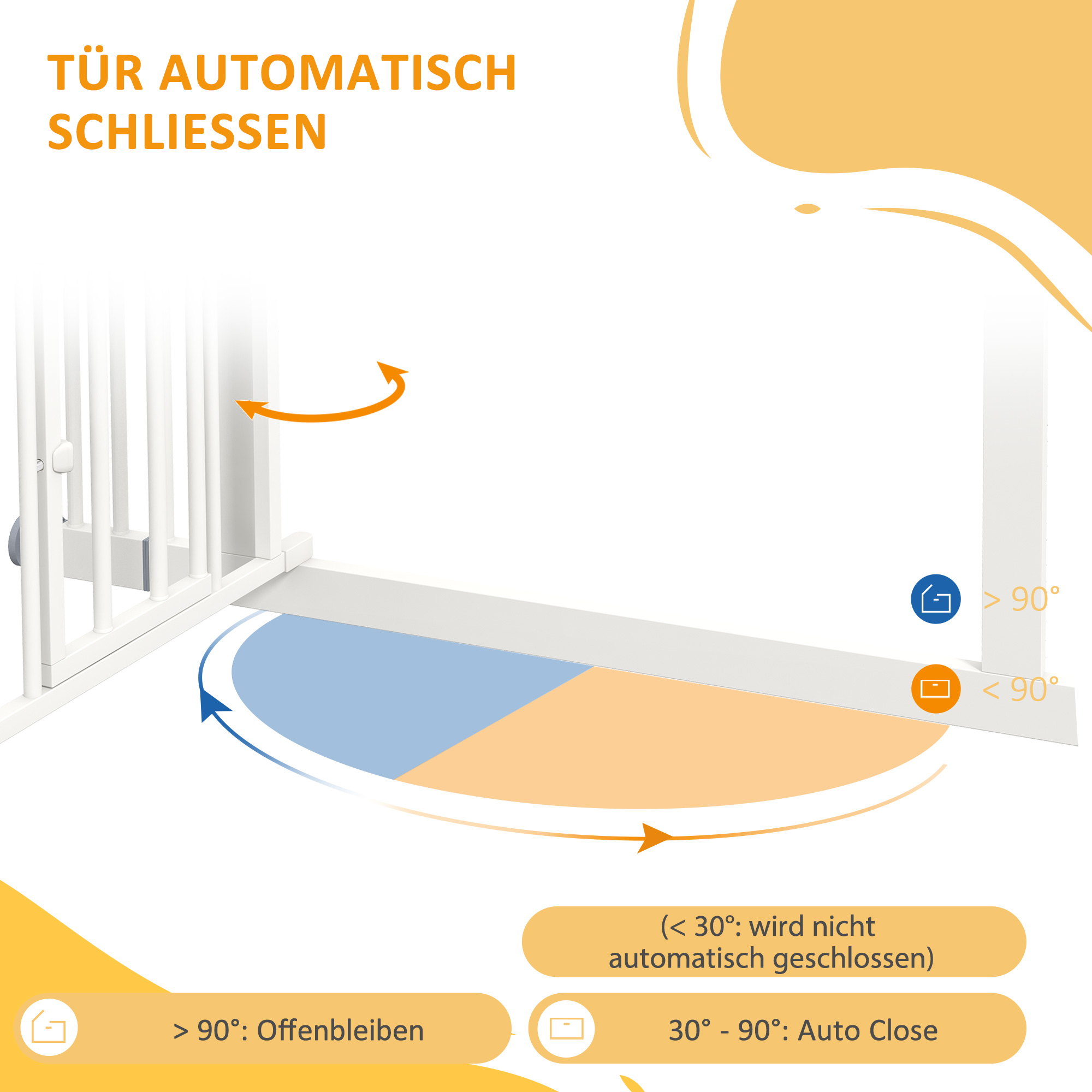 - Tür schließt automatisch unter 90°; bleibt unter 30° offen.