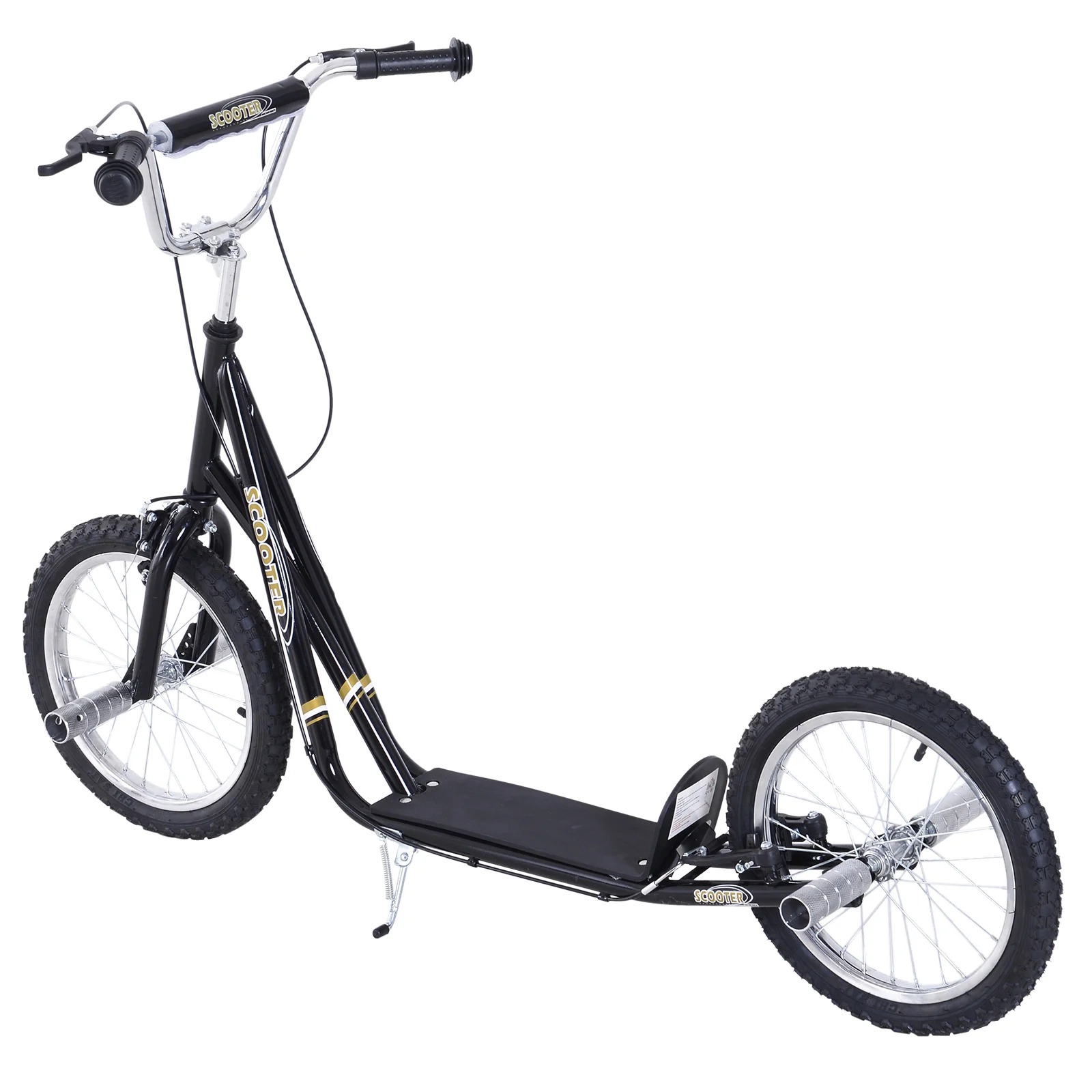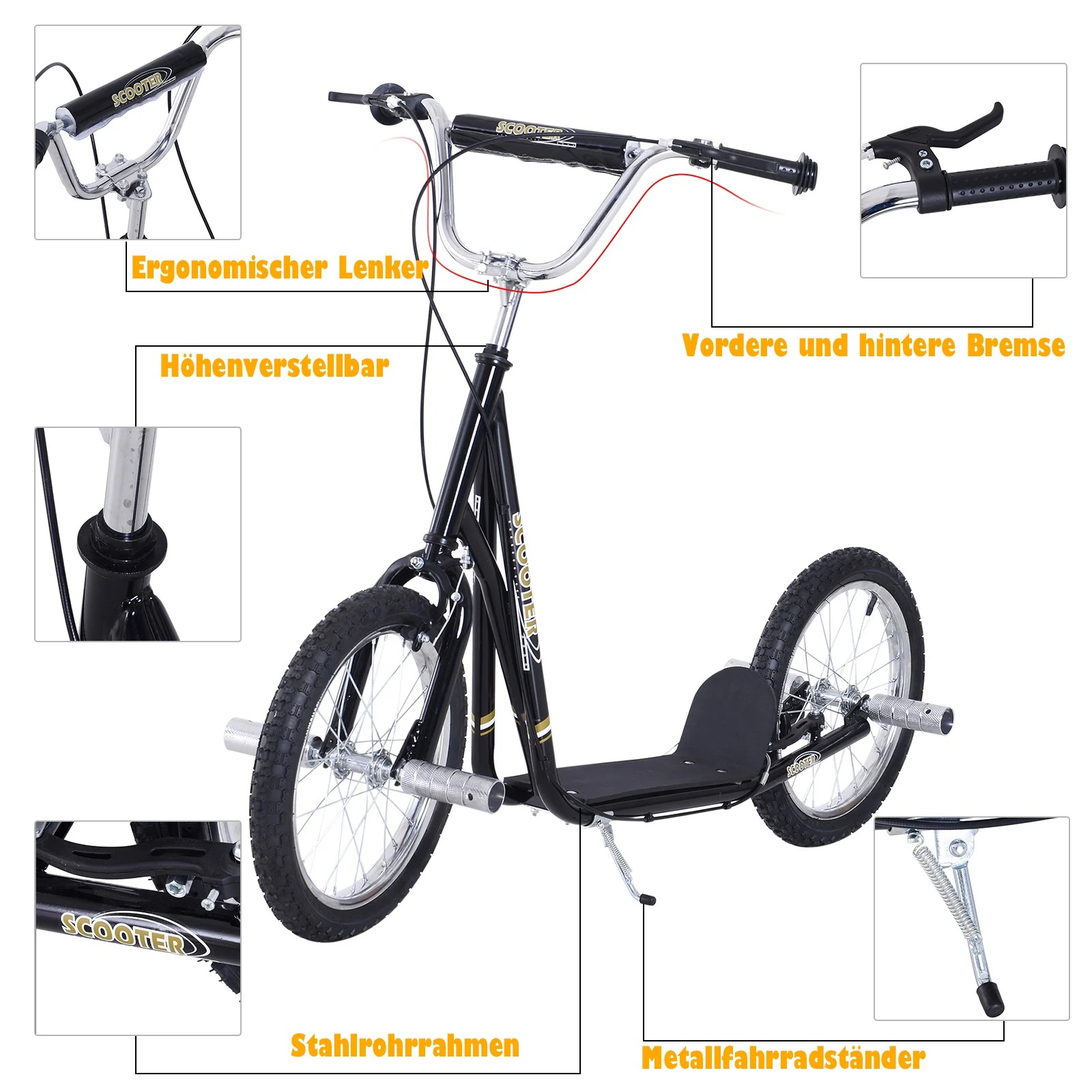 Ein Tretroller für die ganze Familie. Nicht nur für Kinder, sondern auch Geschwister, Eltern und Freunde. Denn für’s schnellere Vorankommen zum Bäcker oder zur Arbeit eignet sich der Roller ebenfalls hervorragend. Dank 16“ Felgen und Luftbereifung gleiten Sie flott voran. Die V-Bremsen werden über den Lenker betätigt und bringen Sie sicher zum Stehen. Und dank des Ständers können Sie den Roller ganz bequem abstellen, ohne Ihn hinlegen zu müssen. Machen Sie Ihren Kindern eine Freude oder entdecken Sie städtische Mobilität neu! Mit dem Tretroller von HOMCOM. Beschreibung: