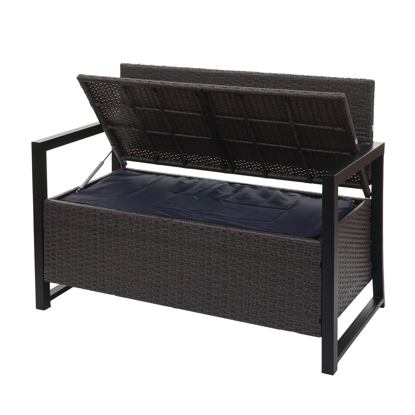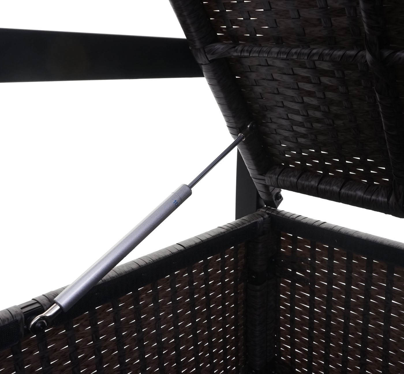 Die Truhenbank ist aus hochwertigem Polyrattan gefertigt, das nicht nur elegant aussieht, sondern auch wetterfest, UV-beständig und pflegeleicht ist. Das Gestell aus pulverbeschichtetem Stahl sorgt für zusätzliche Stabilität. Die wasserabweisenden Kissenbezüge lassen sich abnehmen und waschen.