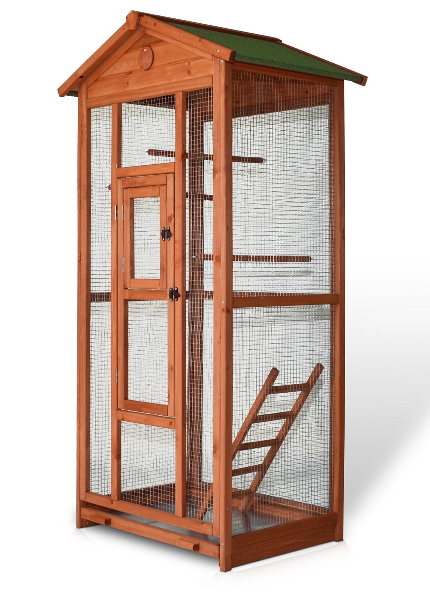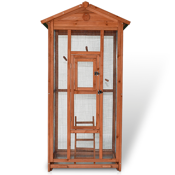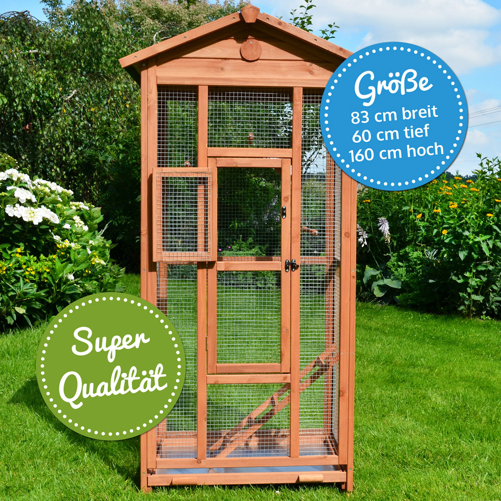 Eine große und eine kleine Tür an der Vorderseite sorgen für einen einfachen Zugang zum Voliereninneren. Dort finden die Vögel auf unterschiedlichen Höhen drei Sitzstangen aus Holz. Auf der Holzleiter können die kleinen Piepmätze nach Herzenslust springen und spielen.