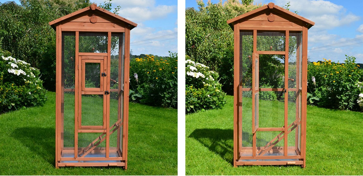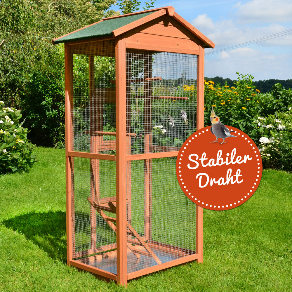 Die geräumige Vogelvoliere „Modell L“, aus lasiertem, wetterfesten Nadelholz bietet ausreichend Platz für mehrere Vögel, die hier auch zu kleinen Flügen starten können.