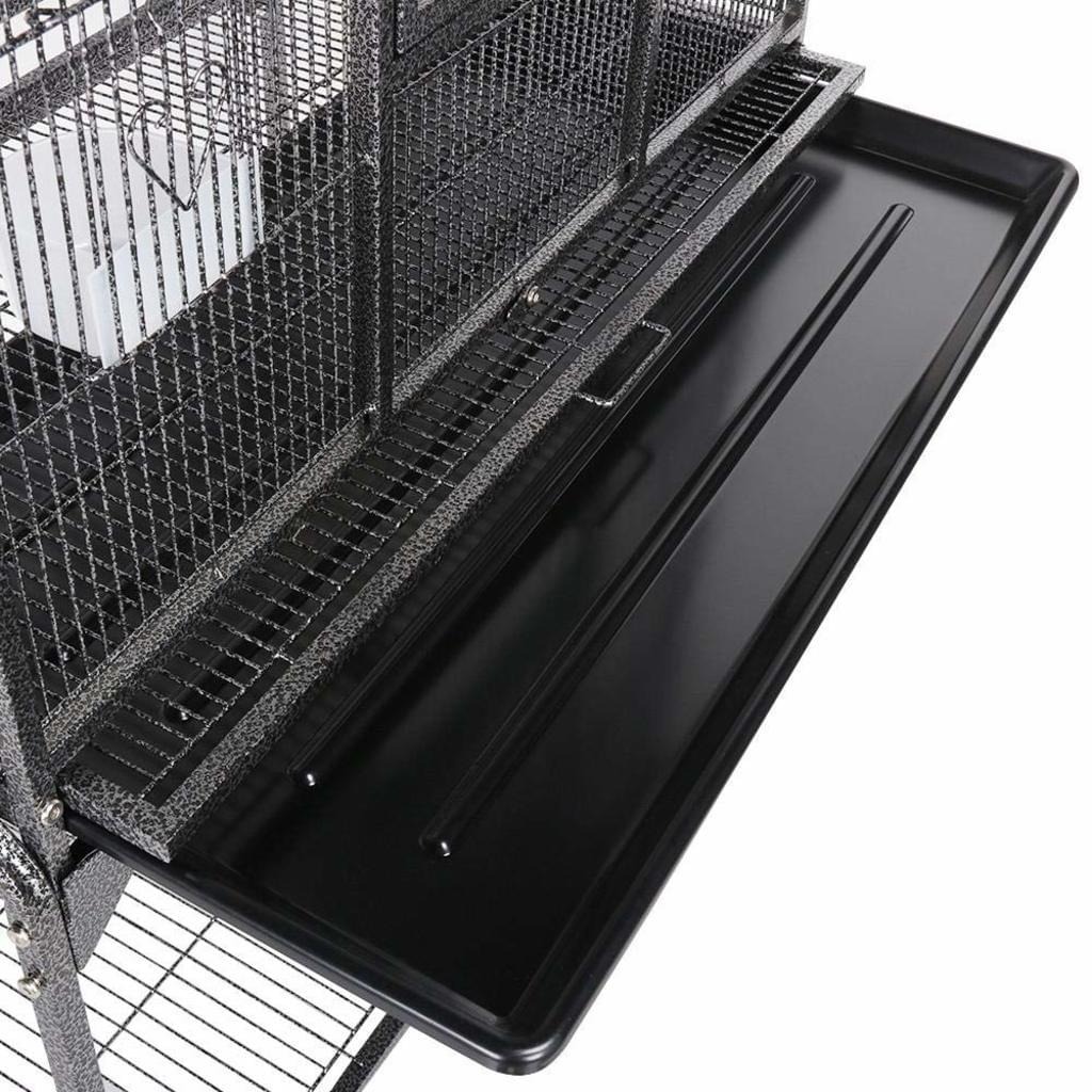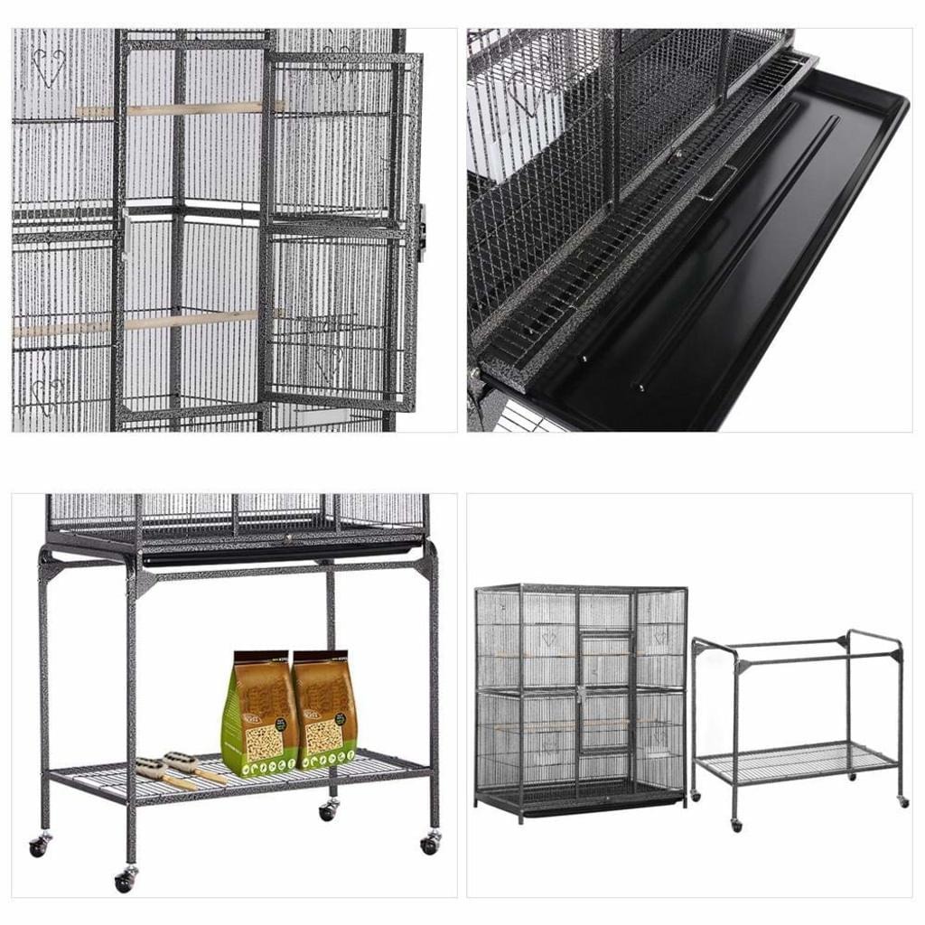 Der Vogelkäfig bietet außerdem viel Raum für eine artgerechte Haltung von großen Vögeln oder mehrerer kleiner Vögel. Durch die vier Rollen lässt sich die Voliere sehr leicht bewegen. Die großen rechteckigen Türen können von Außen leicht geschlossen oder geöffnet werden. Für Vögel ist die Verriegelung jedoch nicht erreichbar. Die große Gittertür (Breite: ca. 25,5 cm, Höhe ca. 47,5 cm) ermöglicht Ihren Tieren einen bequemen Ein- und Ausstieg. Ihnen bietet die große, stabile Tür ausreichend Freiraum für die Gestaltung des Käfigs. Eine Schublade im Bodenbereich erleichtert Ihnen die Reinigung der Voliere. Das zusätzliche Regal unterhalb des Käfigs, bietet zusätzlichen Stauraum um alle Utensilien für die Tiere zu lagern.