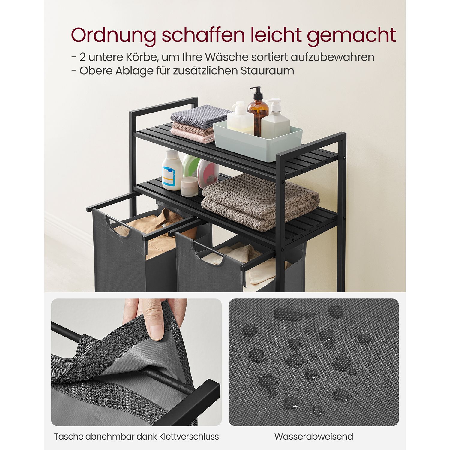 2 Wäschesäcke (46 l pro Korb) & 2 Ablagen für Waschmittel & Handtücher.