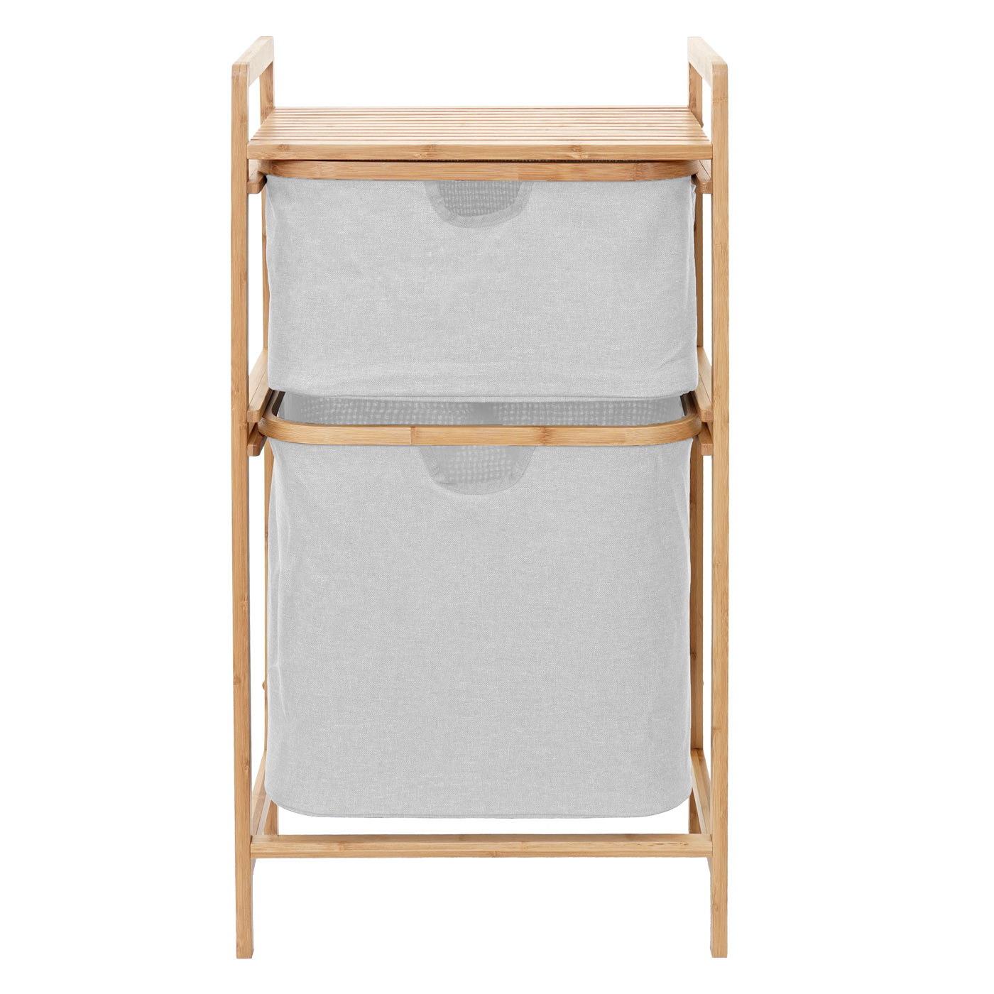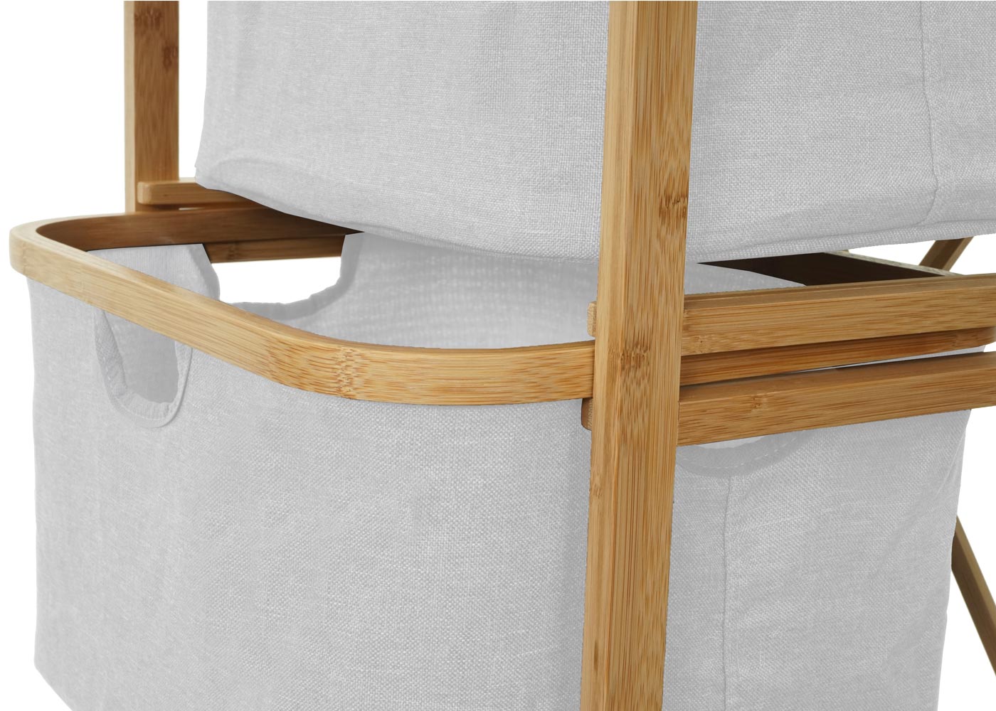 Dieser Wäschesammler aus Bambus mit Einschüben aus Textil hilft Ihnen bei der Vorsortierung der Bunt- und Weißwäsche oder verstaut dekorativ Handtücher oder Badutensilien. Die Einschübe sind einzeln entnehmbar und haben praktische Eingriffe für einen mühelosen Transport der Wäsche. Die Ablagefläche oben bietet Platz für weitere Gegenstände aus Bad- oder Schlafzimmer. Das Bambusmaterial des Regals verleiht ihm nicht nur eine natürliche Schönheit, sondern ist auch äußerst robust und langlebig. Es ist resistent gegen Feuchtigkeit und bietet somit eine ideale Lösung für den Einsatz im Badezimmer. Natürlich können Sie dieses Regal auch in vielen weiteren Räumen einsetzen, z.B. als Aufbewahrung für Spielzeug oder Stofftiere im Kinderzimmer. Bringen Sie Ordnung und Stil in Ihr Zuhause mit dem Wäschesammler B56. Bestellen Sie noch heute und erleben Sie die Leichtigkeit der Wäschetrennung und -aufbewahrung!