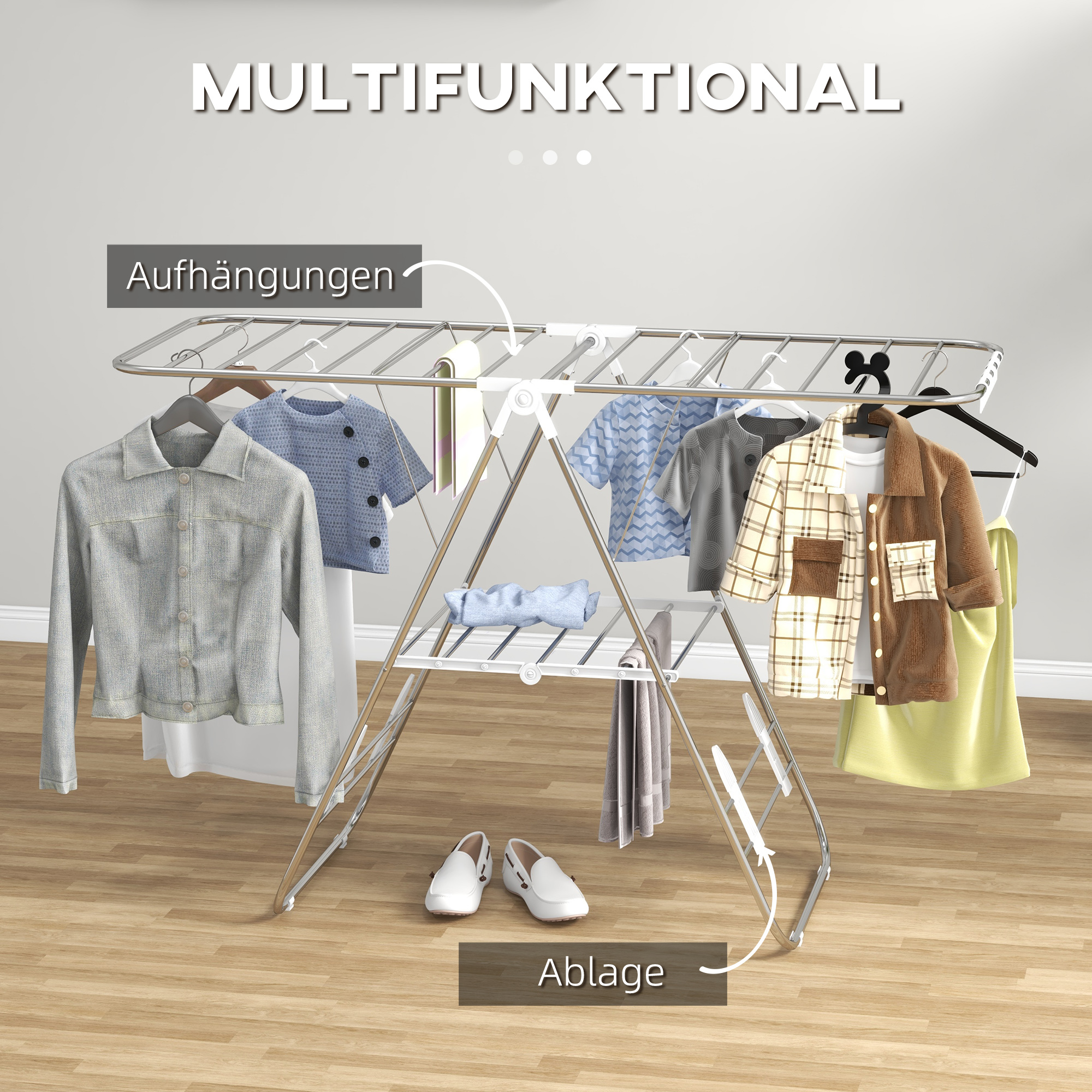 Dieser Wäscheständer bietet reichlich Platz zum Trocknen von Kleidung und Handtüchern. Neben den zwei Flügeln stehen zusätzliche Querverstrebungen zur Verfügung, um Ihre Wäsche effizient aufzuhängen. Hergestellt aus rostfreiem Edelstahl, ist er dank Gummipads rutschfest. Zusammengeklappt lässt sich der Ständer platzsparend verstauen, was ihn zu einem praktischen und langlebigen Haushaltshelfer macht.