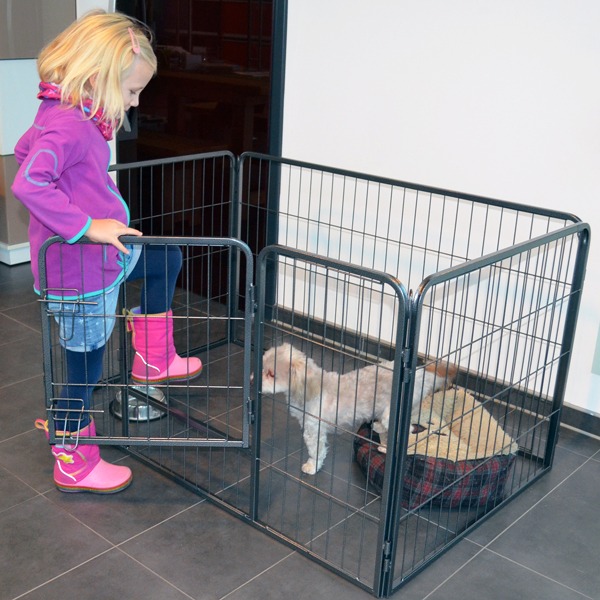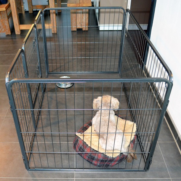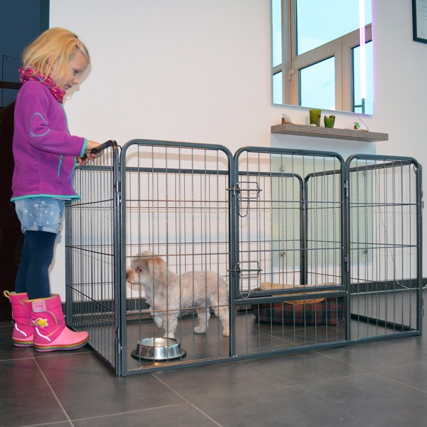 Die Elemente werden einfach miteinander verbunden, indem man Stäbe von ob durch die Verbindungen steckt. Diese Stäbe können im Außenbereich auch bis in den Boden gesteckt und der Auslauf somit im Boden verankert und fixiert werden. Der Auslauf für Welpen und ausgewachsene Hunde ist sehr robust und aus lackiertem Metall gefertigt. Der Auslauf kann also auch wunderbar im Außenbereich platziert werden. Aber auch im Haus macht der Auslauf sich super und der Hund genießt seinen sicheren Rückzugsort, von dem aus er alles beobachten kann.