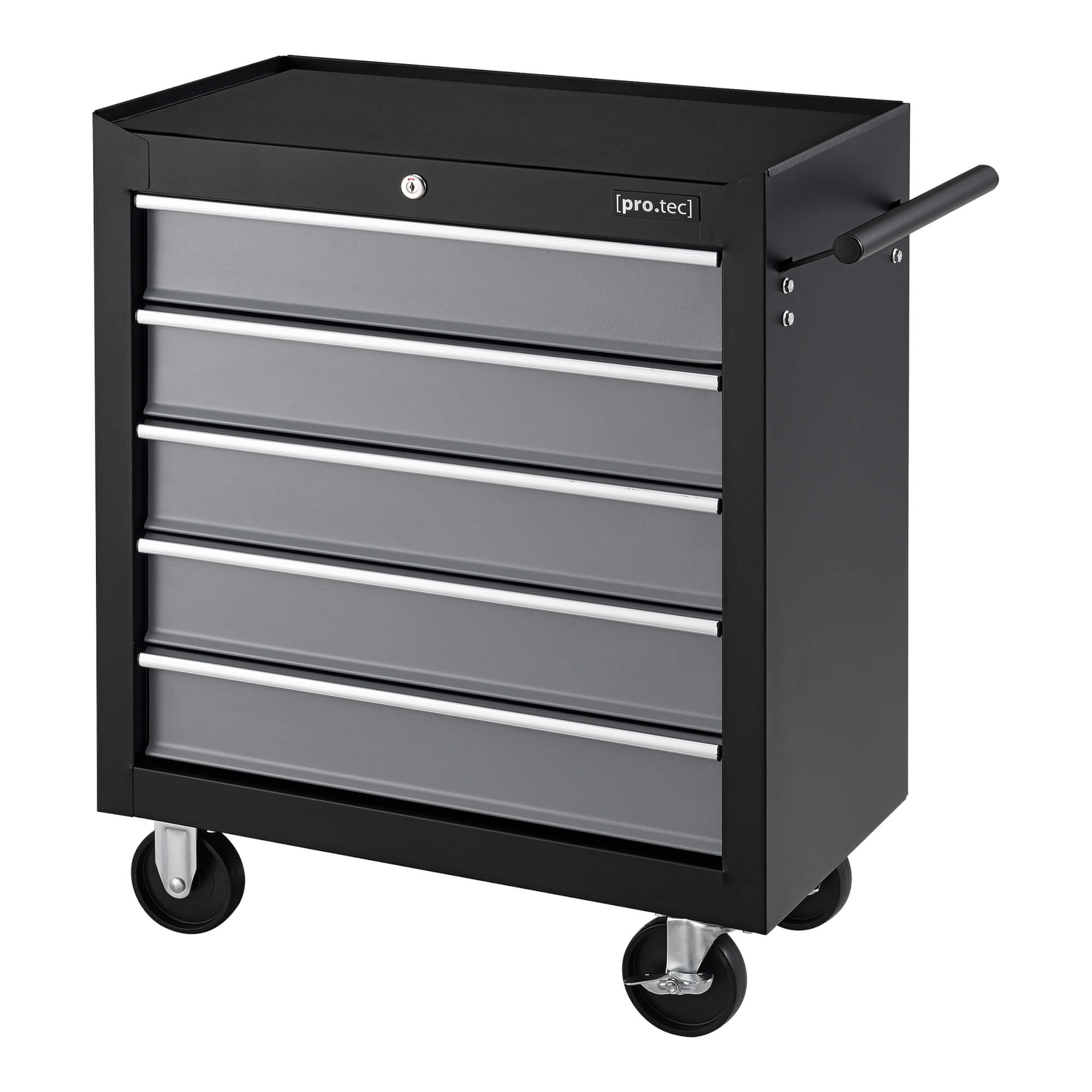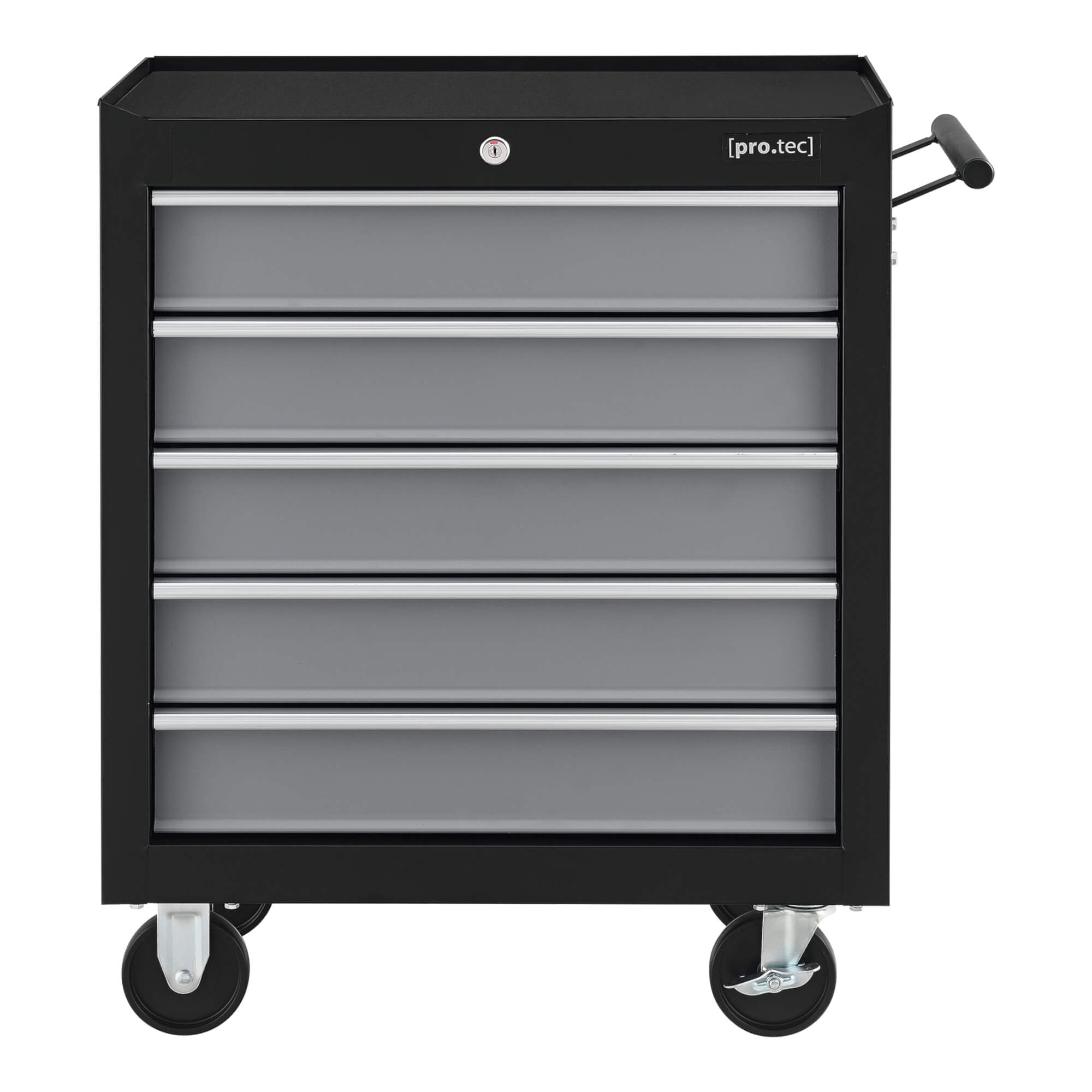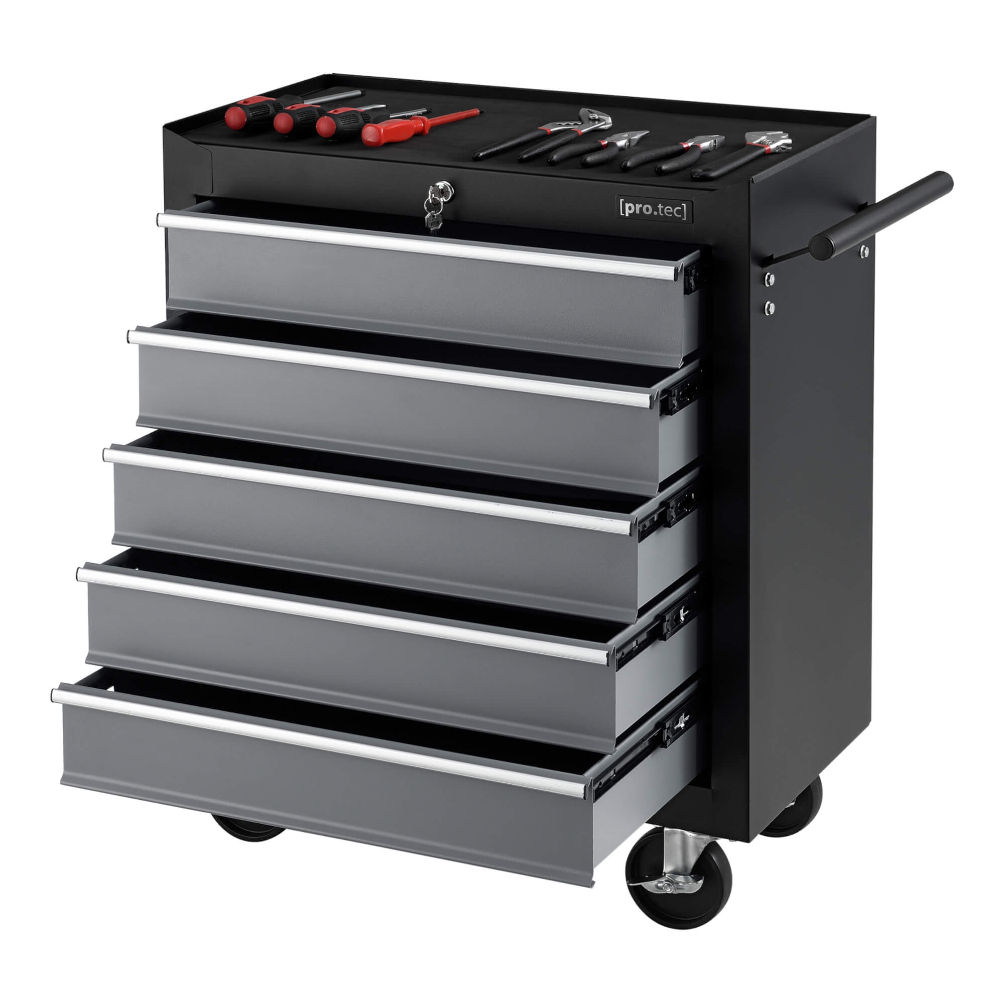 Der Werkzeugwagen sorgt für Ordnung in Ihrer Garage oder Ihrer Werkstatt. Die Schubladen lassen sich abschließen, um sie vor unbefugten Zugriff zu schützen oder ein ungewolltes Öffnen während der Fahrt zu verhindern. Die vier Rollen ermöglichen einen mobilen Einsatz und verfügen über zwei Feststellbremsen.
