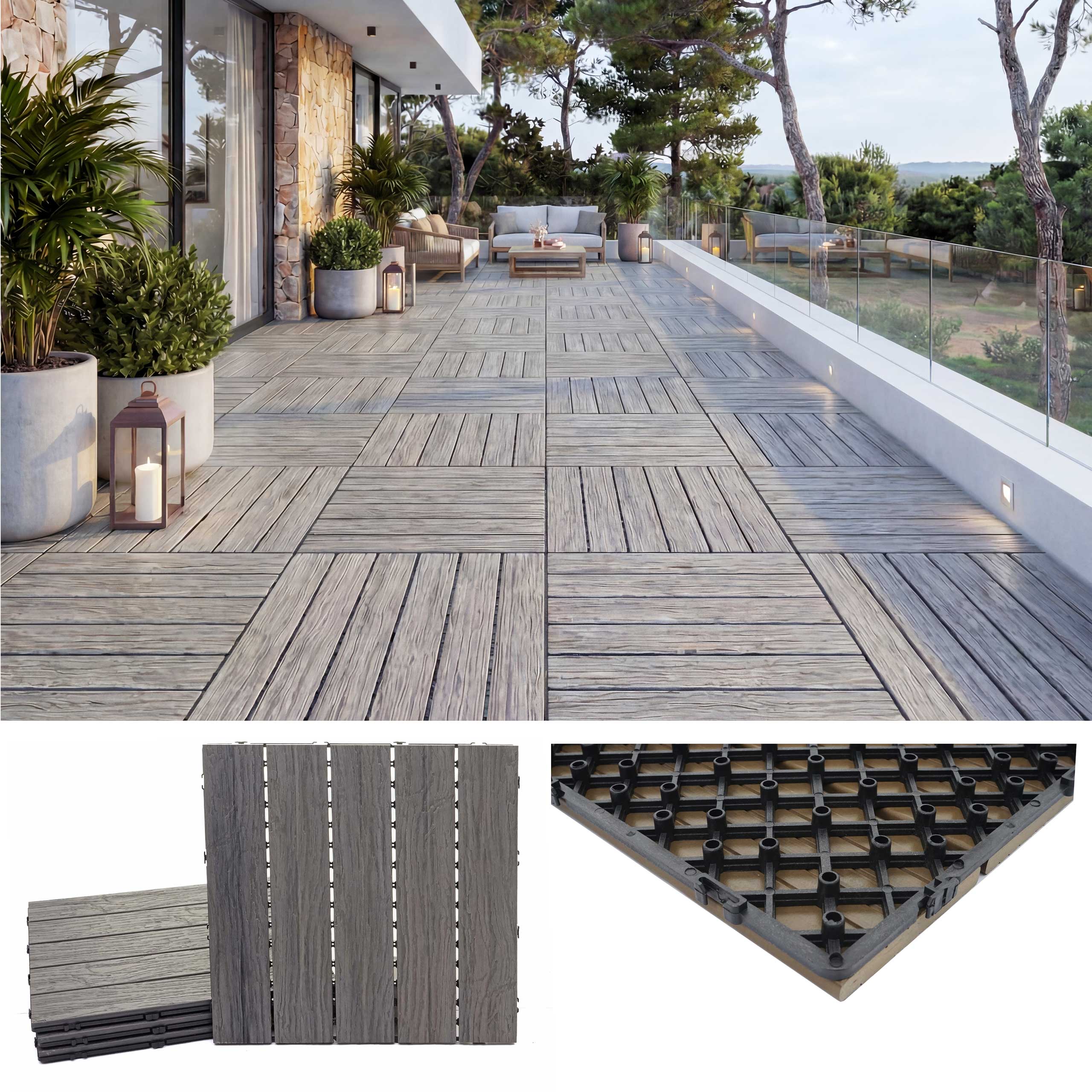 Verleihen Sie Ihrem Balkon. Ihrer Terrasse. dem Garten oder auch Innenräumen wie Keller und Wintergarten einen modernen. hochwertigen Look – mit diesen robusten WPC Terrassenfliesen. Dank ihrer 3D-Struktur und dem praktischen Stecksystem sind sie im Handumdrehen verlegt und überzeugen durch hohe Belastbarkeit und Langlebigkeit.
