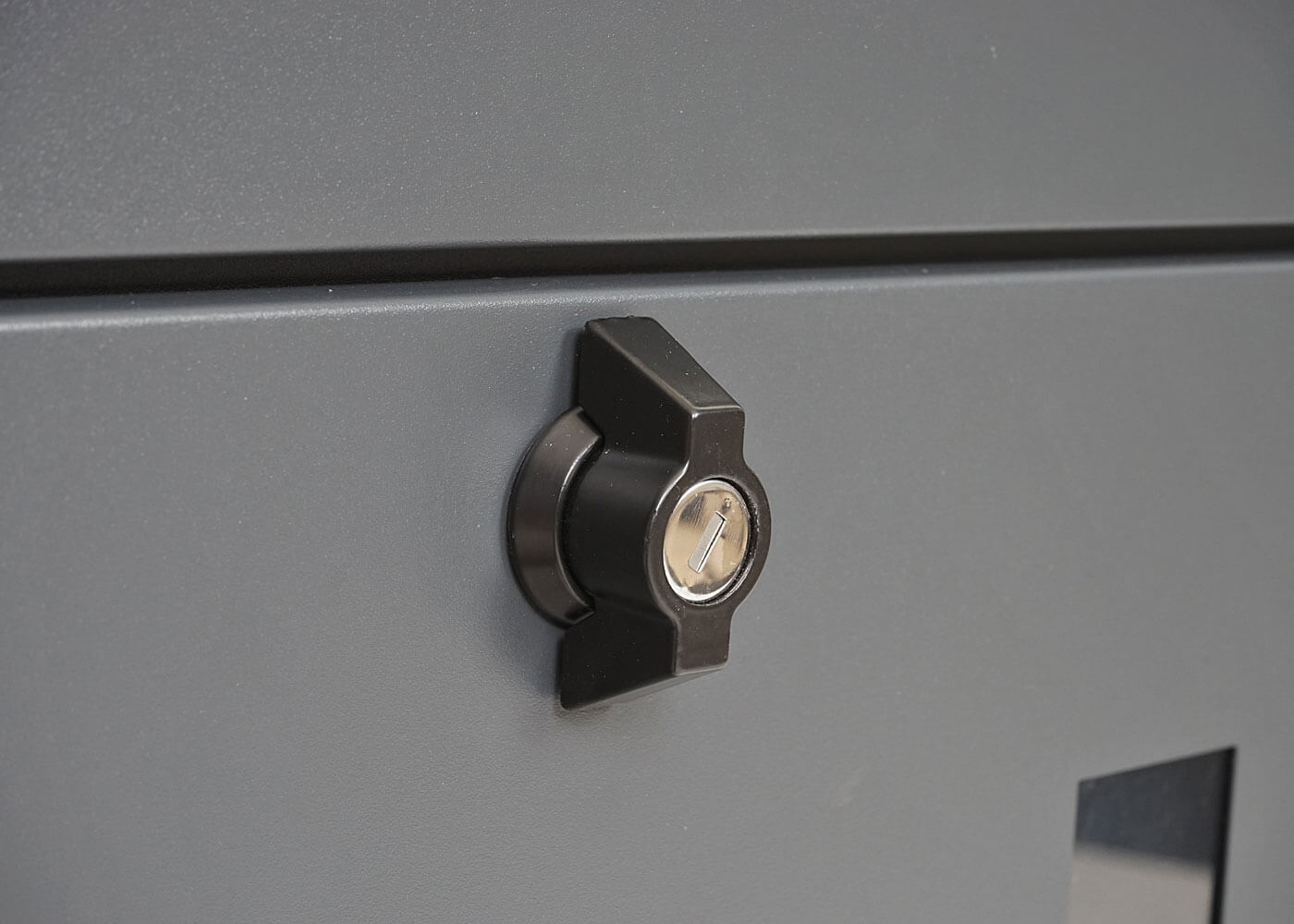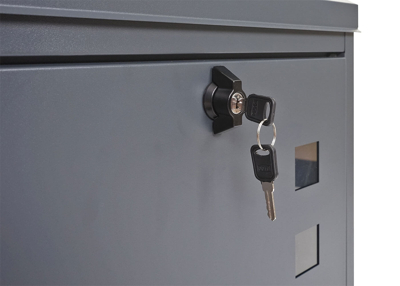 – Dreifachschutz für Ihre Post! Ein Zylinderschloss, die Tiefe des Gewerbe-Briefkastens, wie auch ein besonderer Eingriffschutz beim Einwurf sichert Ihre Post. Hier gibt es keinen normalen Schlitz, sondern der Brief wird aufgelegt und durch das Schließen in den Kasten befördert.